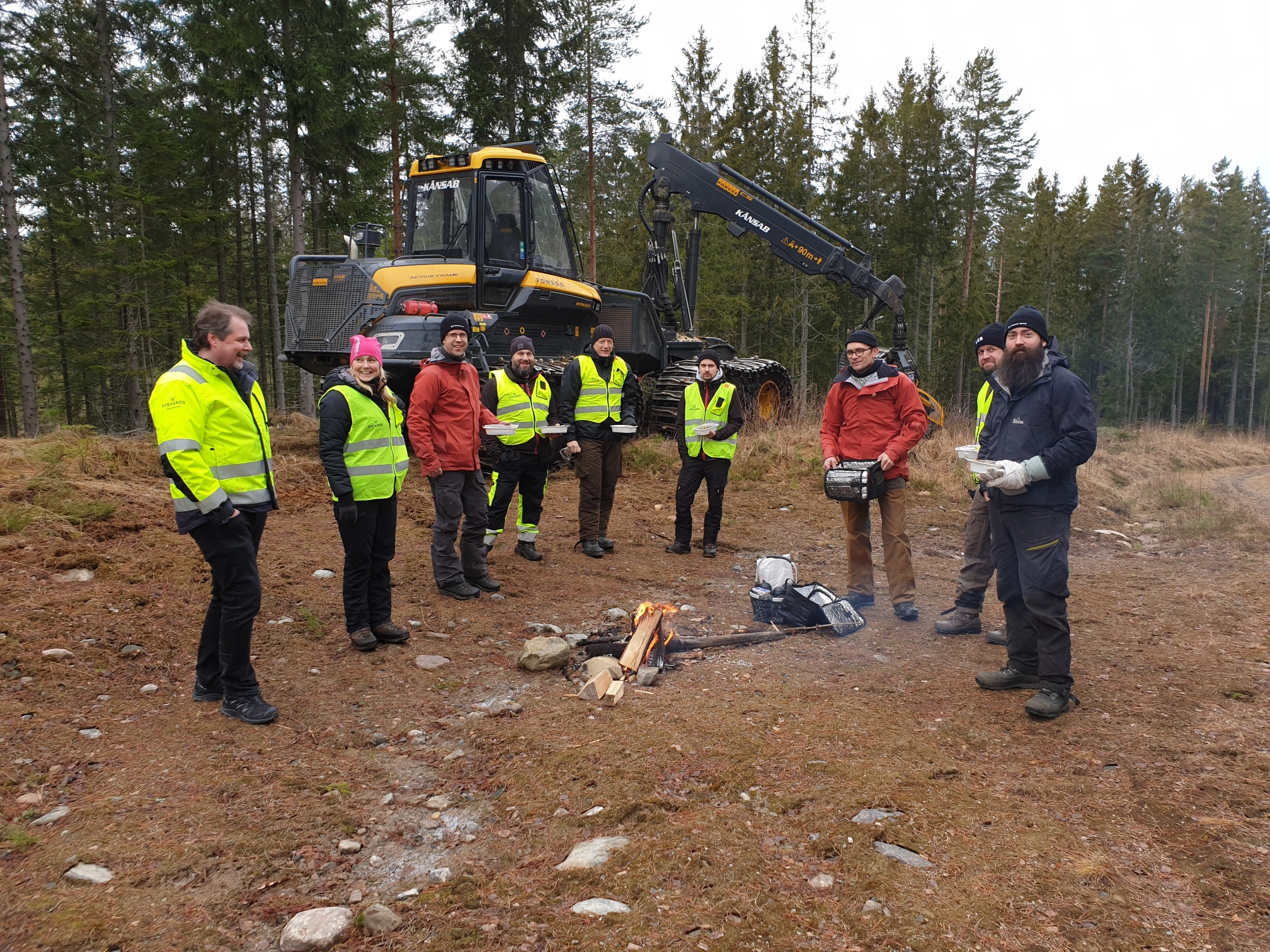 • Beskrivning: Samtal kring elden, samarbete, virkesförsäljning, Gysinge Skog, skratt, glädje, gruppbild, grävmaskin, arbetskläder