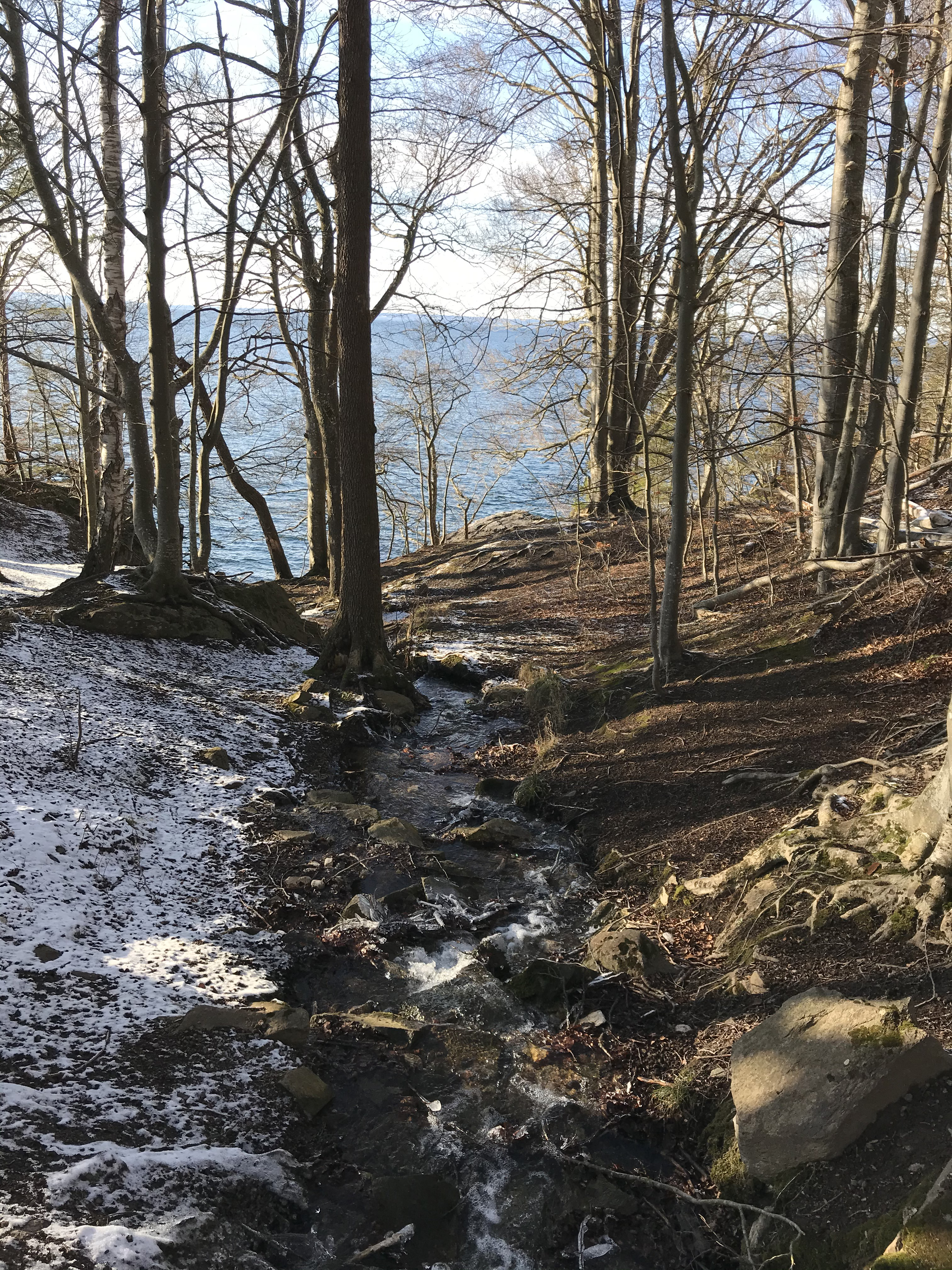- Beskrivning: Fantastiskt fint även på vintern, fina rastplatser, vindskydd och grillplatser finns året om, bäck vid Stocklycke hamn där den rinner ut i Vättern, Ekopark Omberg, äntligen lite snö även i södra Sverige, vårvinter, sol, vatten, utsikt, skog