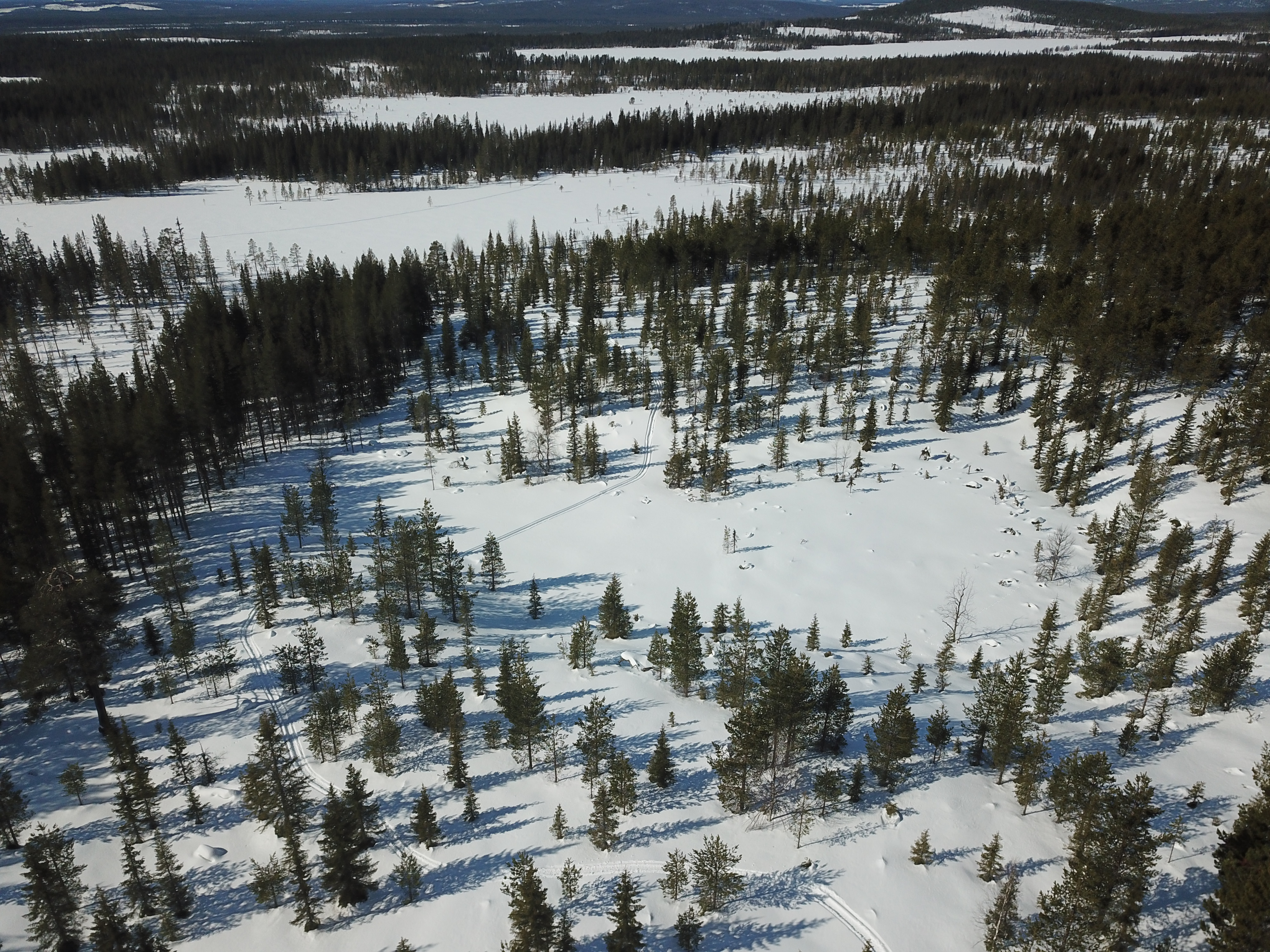 - Beskrivning: Fastighetsobjekt som låg till försäljning på Sveaskog.se i början av Mars 2020, Arjeplog Nyliden, ovanifrån, landskap, skogslandskap, vy, skog, vinter