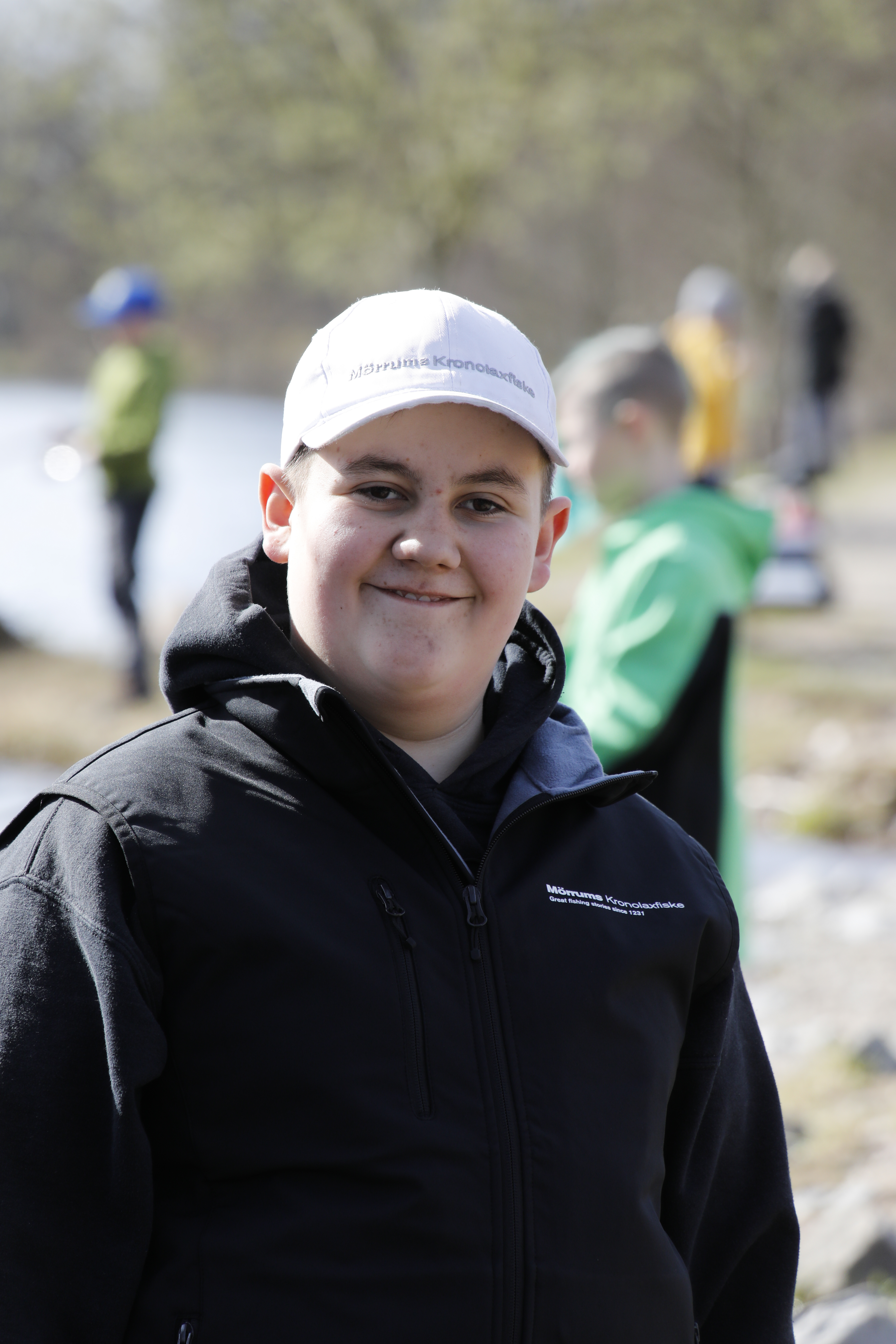 - Beskrivning: För tredje året i rad arrangerade Mörrums Kronolaxfiske årets första Ungdomsfiskets dag i strålande aprilväder under långfredagen. Anton Forsling Vigren från Mörrum gjorde prao på Kronolaxfisket i åttan. Nu är han tillbaka som volontär på Ungdomsfiskets dag och hjälper barnen med tips och trix för att lyckas bättre som fiskare.