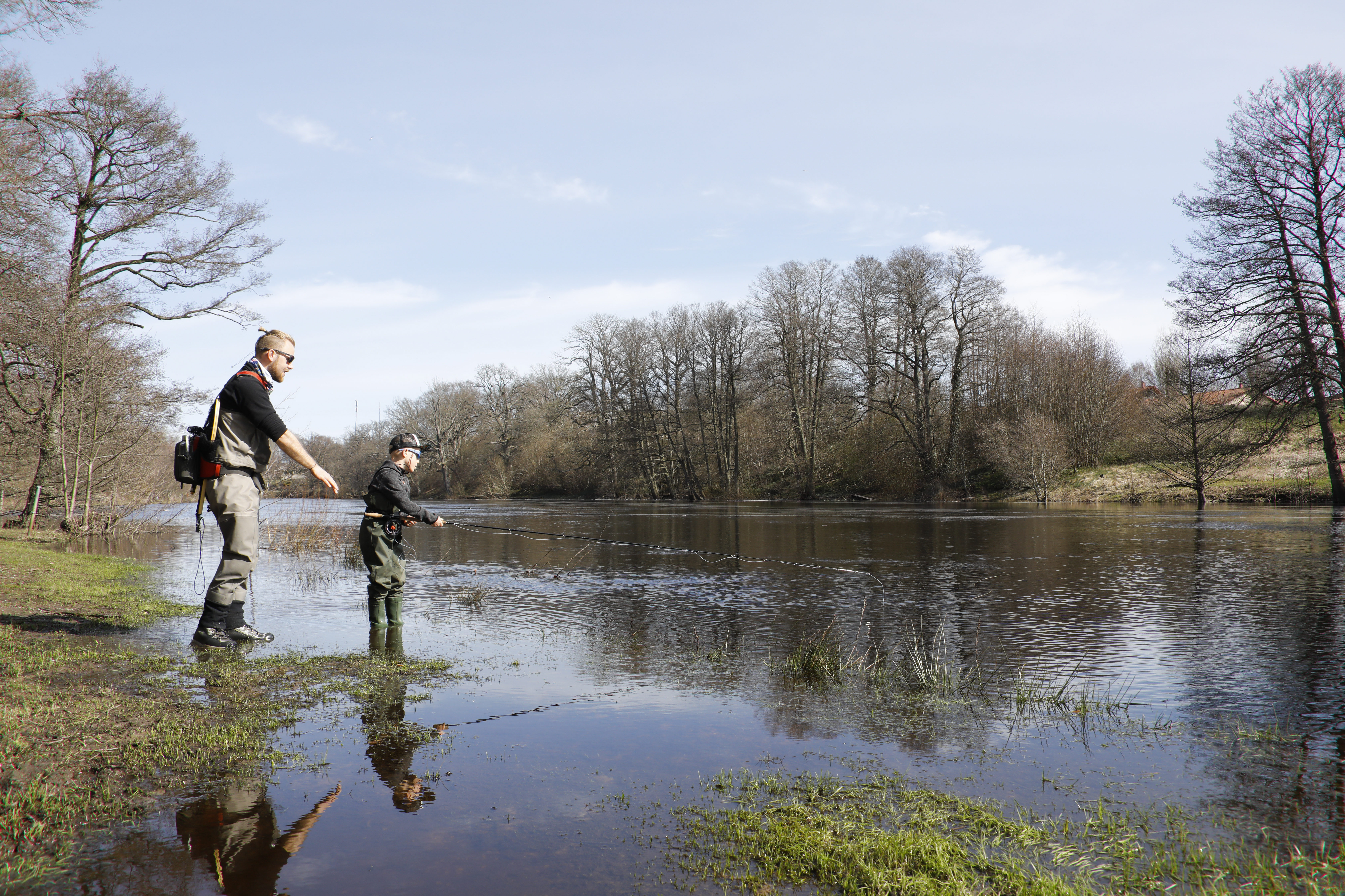 • Beskrivning: För tredje året i rad arrangerade Mörrums Kronolaxfiske årets första Ungdomsfiskets dag i strålande aprilväder under långfredagen. Tidig introduktion till flugfiskets ädla konst. Henrik Mårtensson instruerar sonen Per-Axel Wintervie.