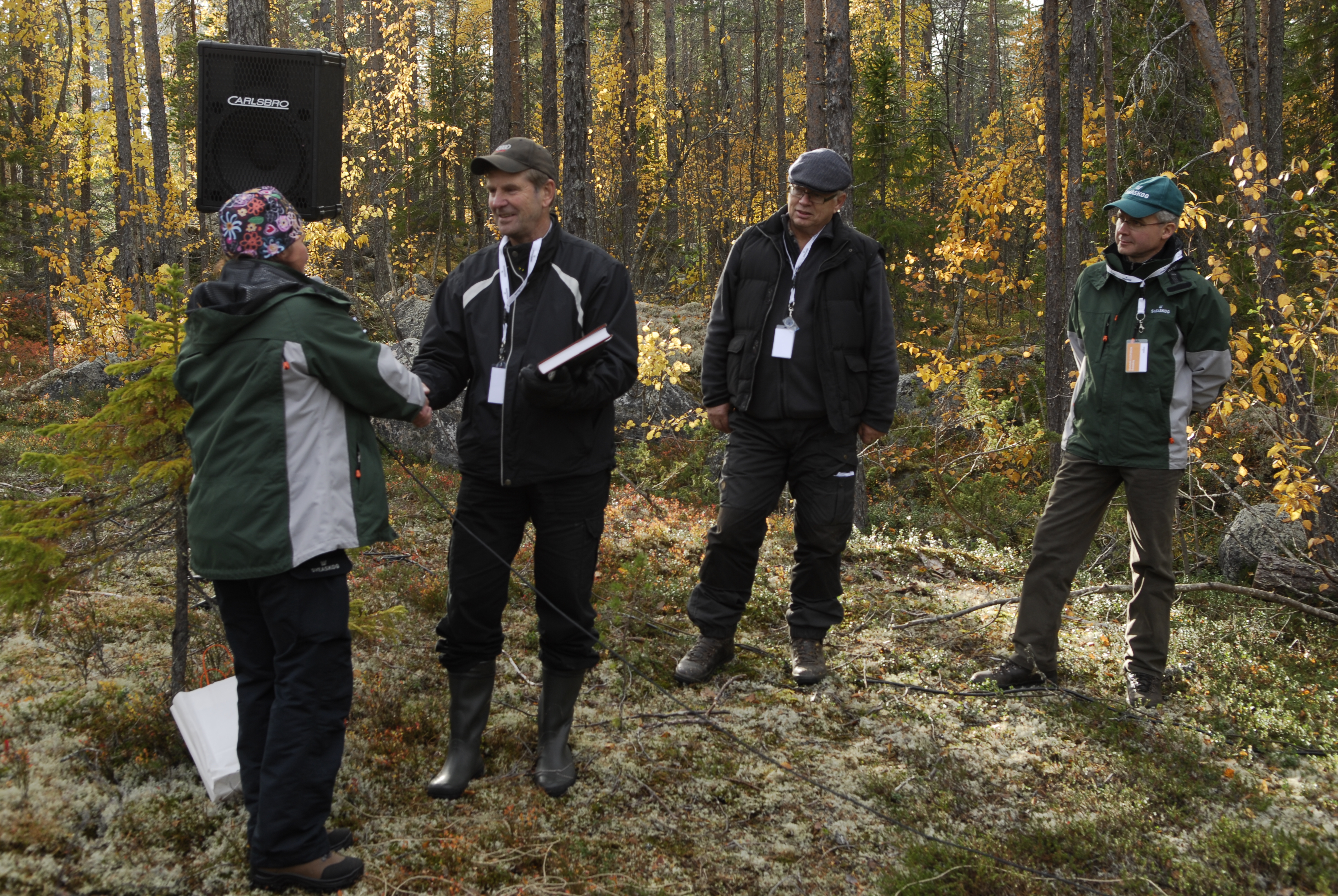 - Beskrivning: Ekopark Jovan, invigning. Eva Ståhl skogsskötselchef, Gunnar Åström kommunalråd Storuman, Staffan Ling moderator och Gunnar Olofsson, VD.