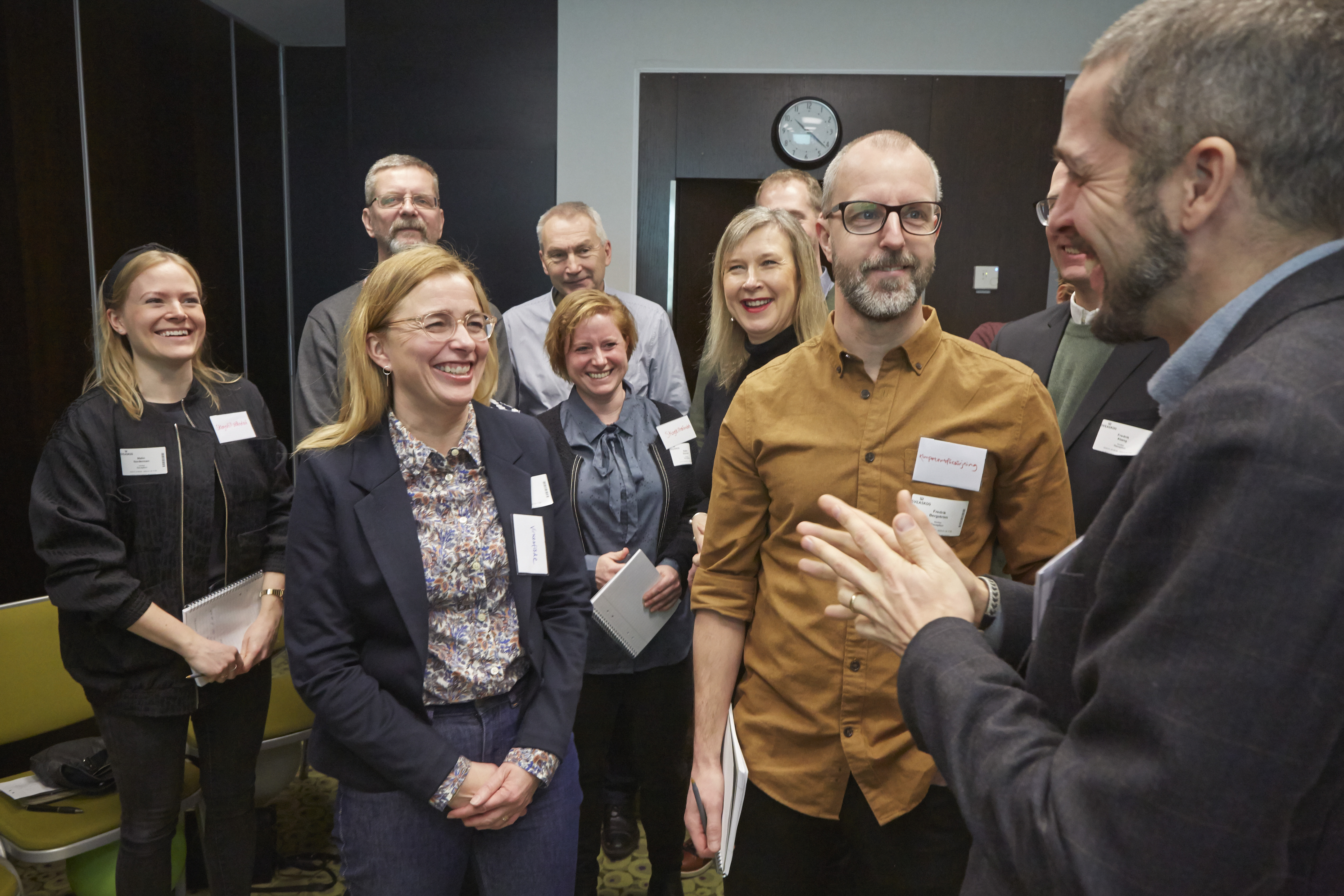 • Beskrivning: Möte, grupparbete, samtal. Glada medarbetare, skratt. Malin Norderman, Ann Eklund, Babs Stuiverm Ove Ohlsson, Nina Arkeberg, Fredrik Bergström, Johan Ekenstedt