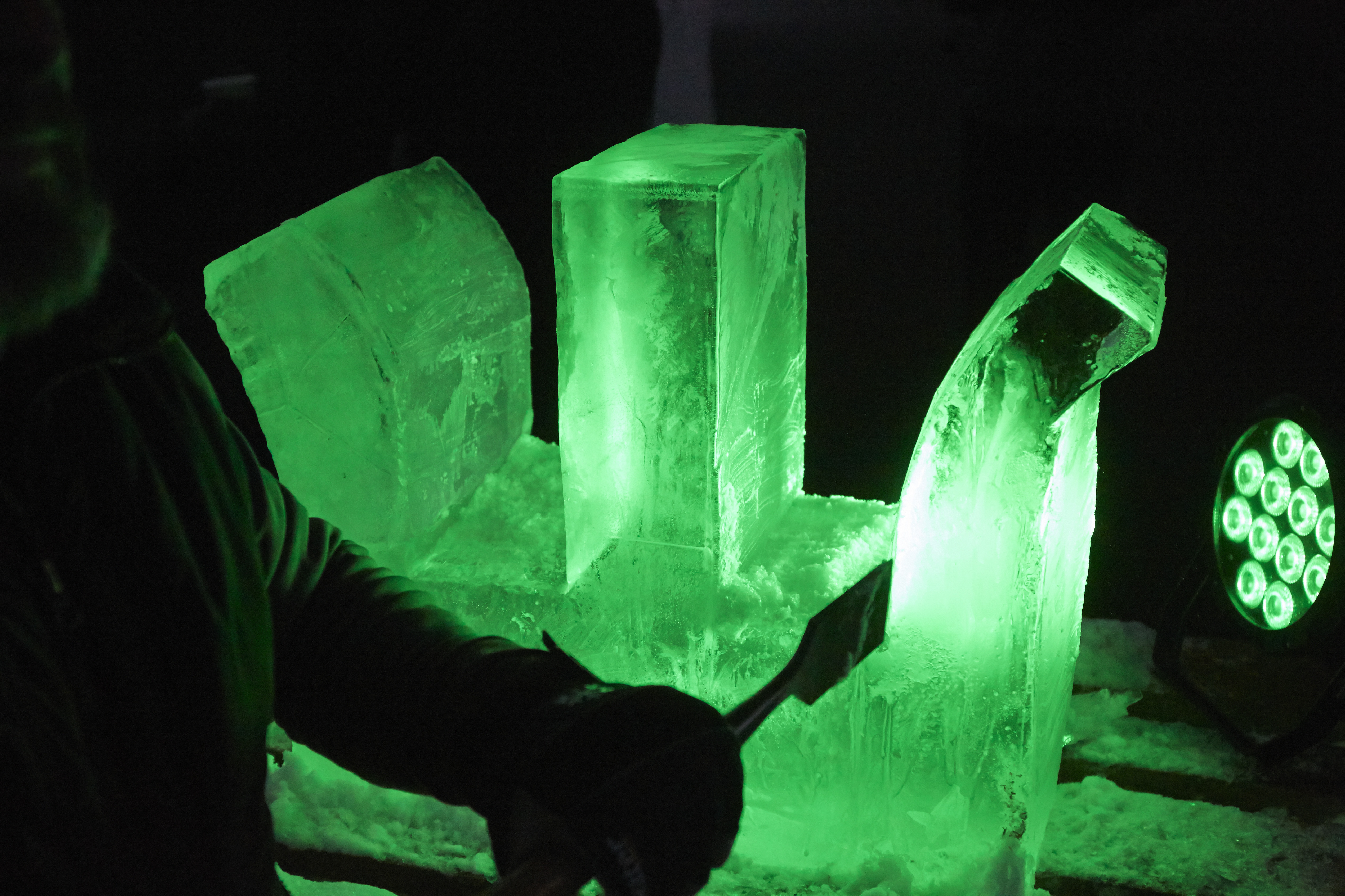 - Beskrivning: Möte, grupparbete, teamwork, Sveaskogs logotyp som isskulptur