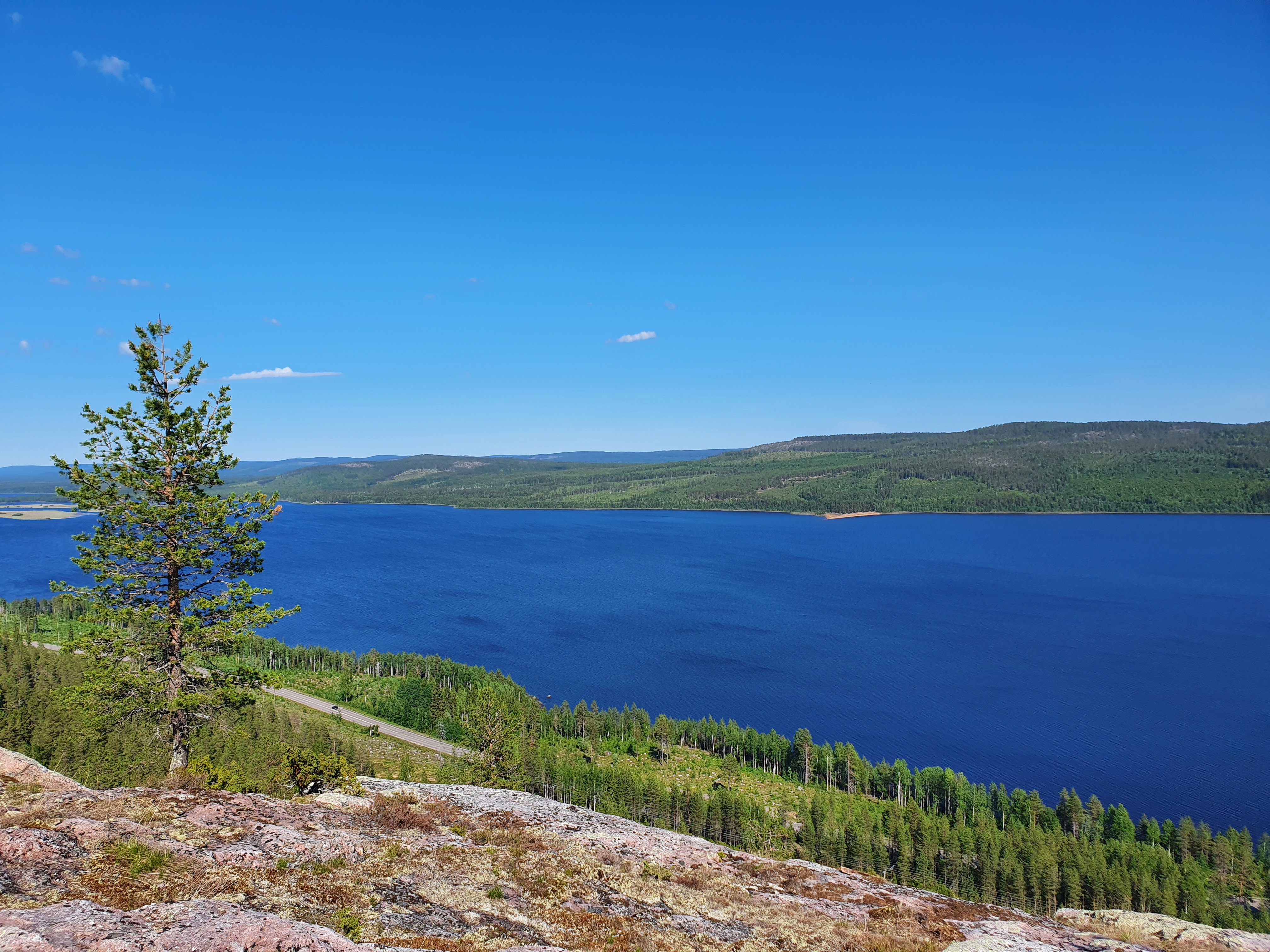 • Beskrivning: Malungsberget/Mjölåsberget utanför Överkalix. Utsikt över Kalix älv, Räktforsen och Räktforsberget, blå himmel