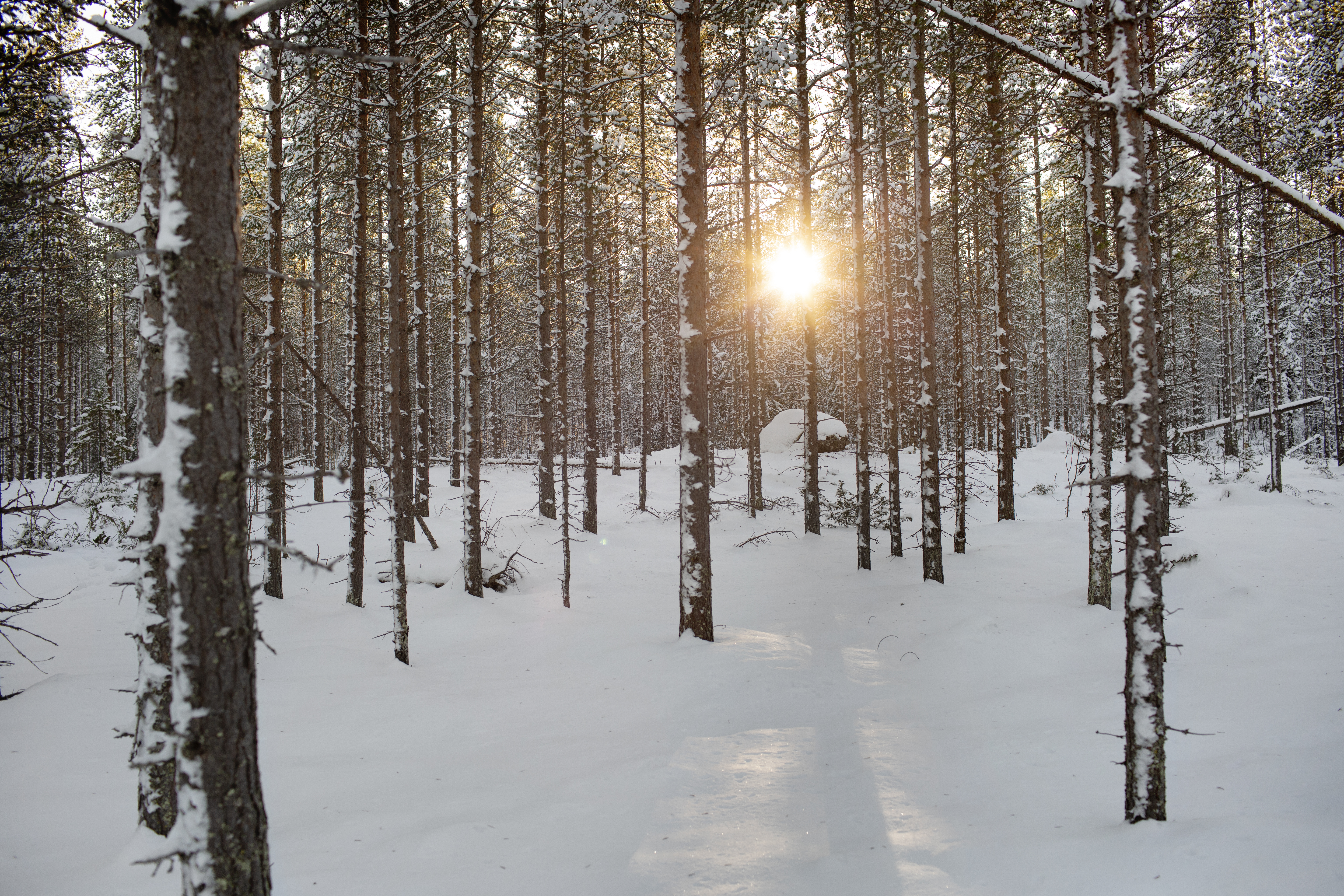 - Beskrivning: Sol mellan träden, tallar, stammar, trädstammar, snö