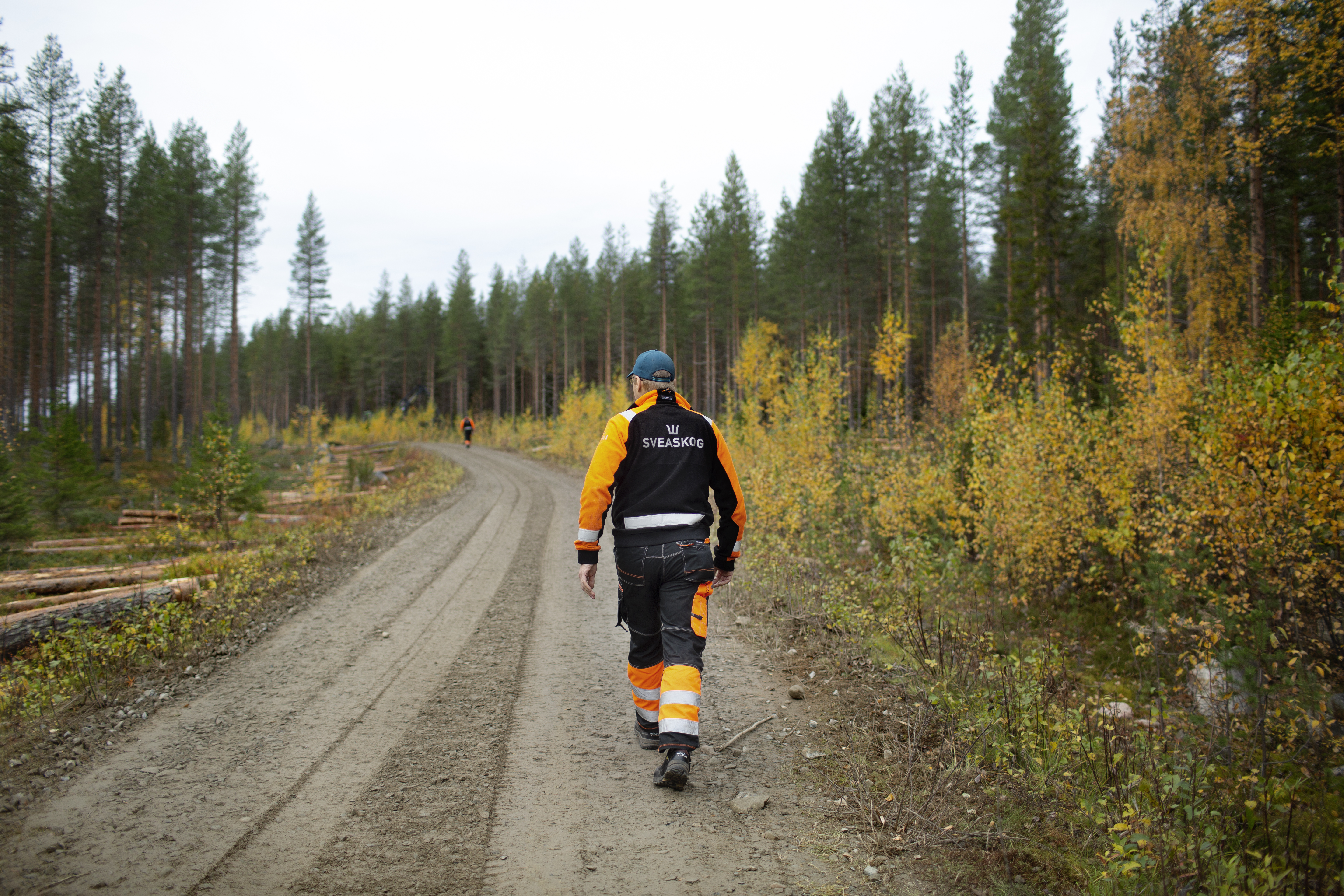 - Beskrivning: Skogsväg, timmer, avlägg, upplägg, avverkning, gallring, Sveaskogs logotyp, arbetskläder, varselkläder