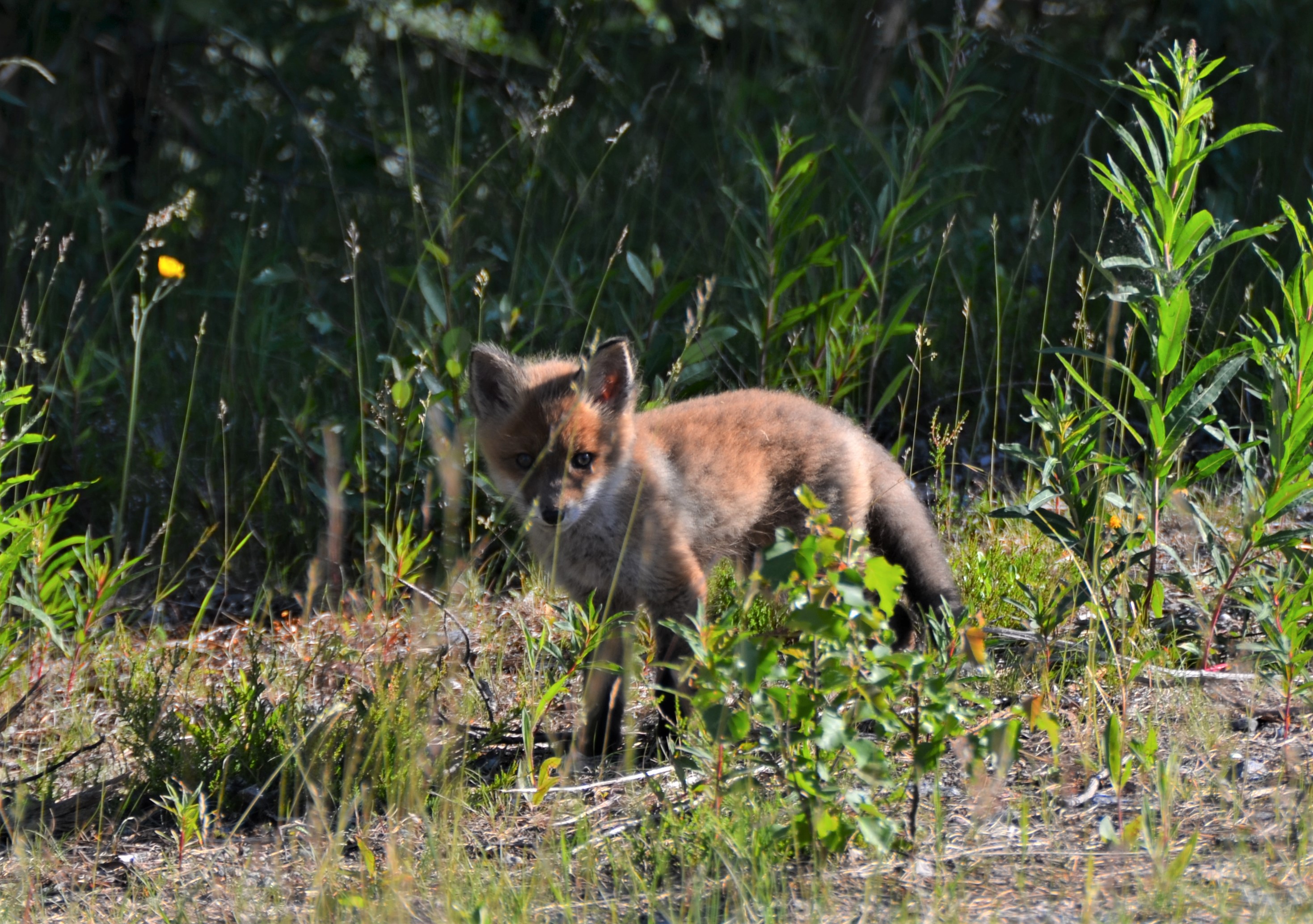 - Beskrivning: Rävunge som kikar fram bakom några plantor. Valp