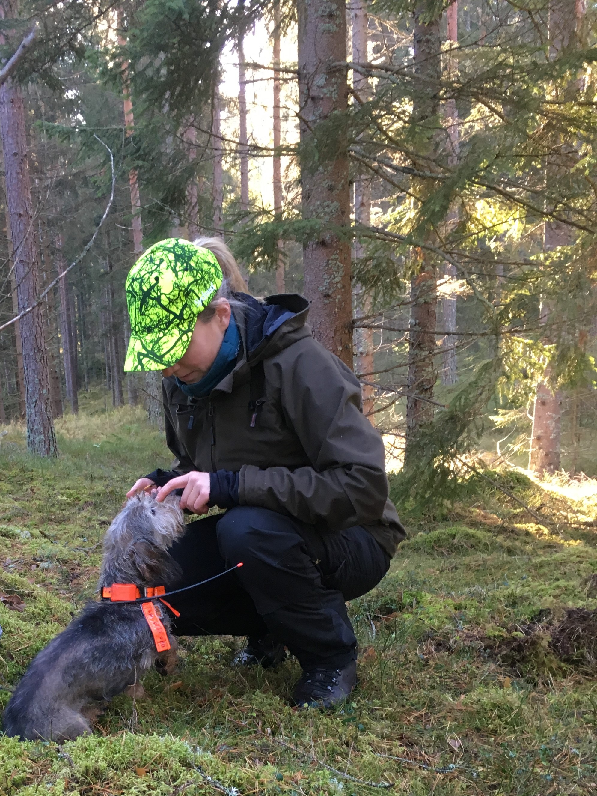 - Beskrivning: Ägare och hund, hunden har på sig en hundpejl, GPS, spårning, pejl