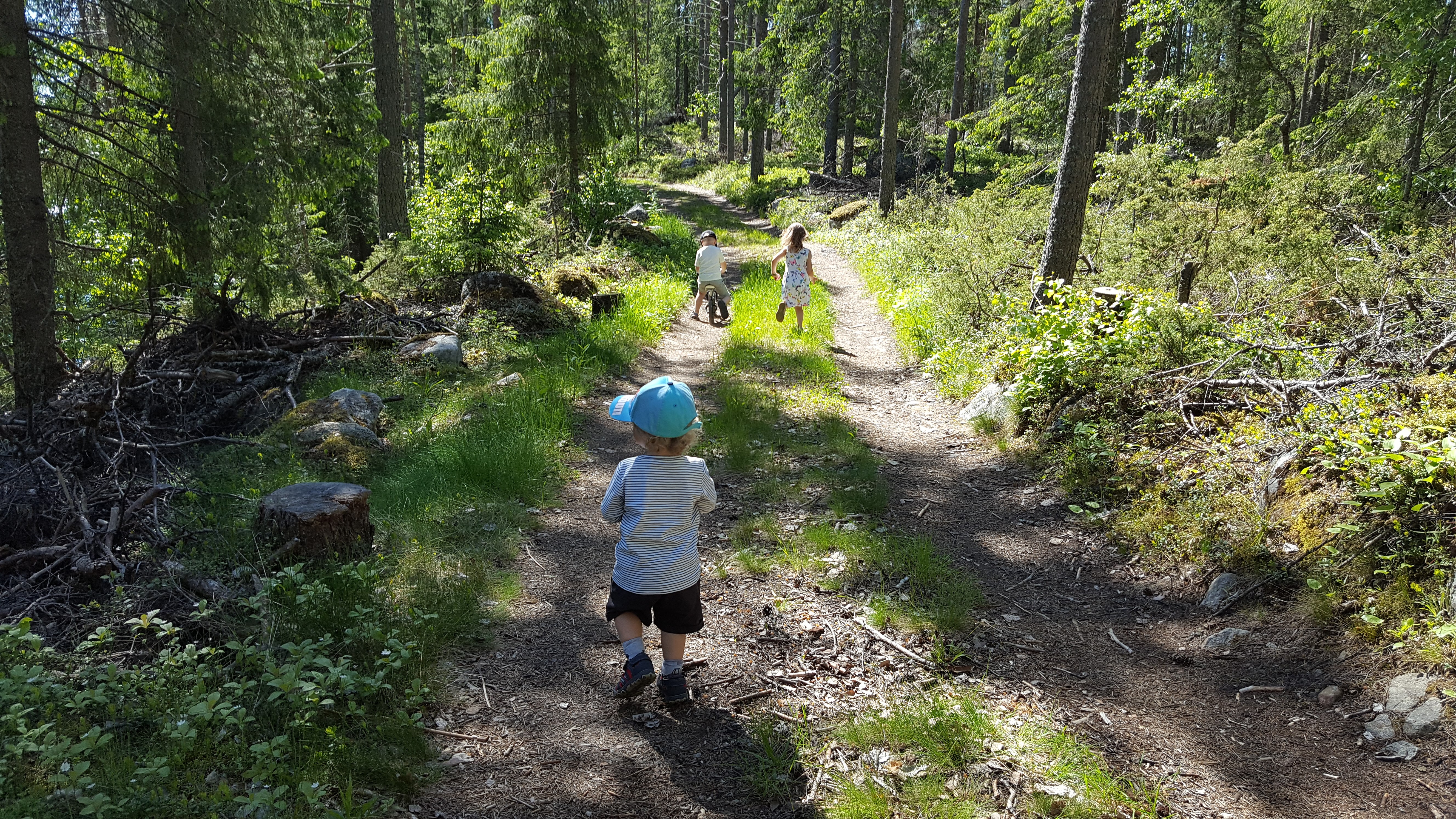 - Beskrivning: Barn, familj, utflykt, skogsväg, stig, sommar, lek
