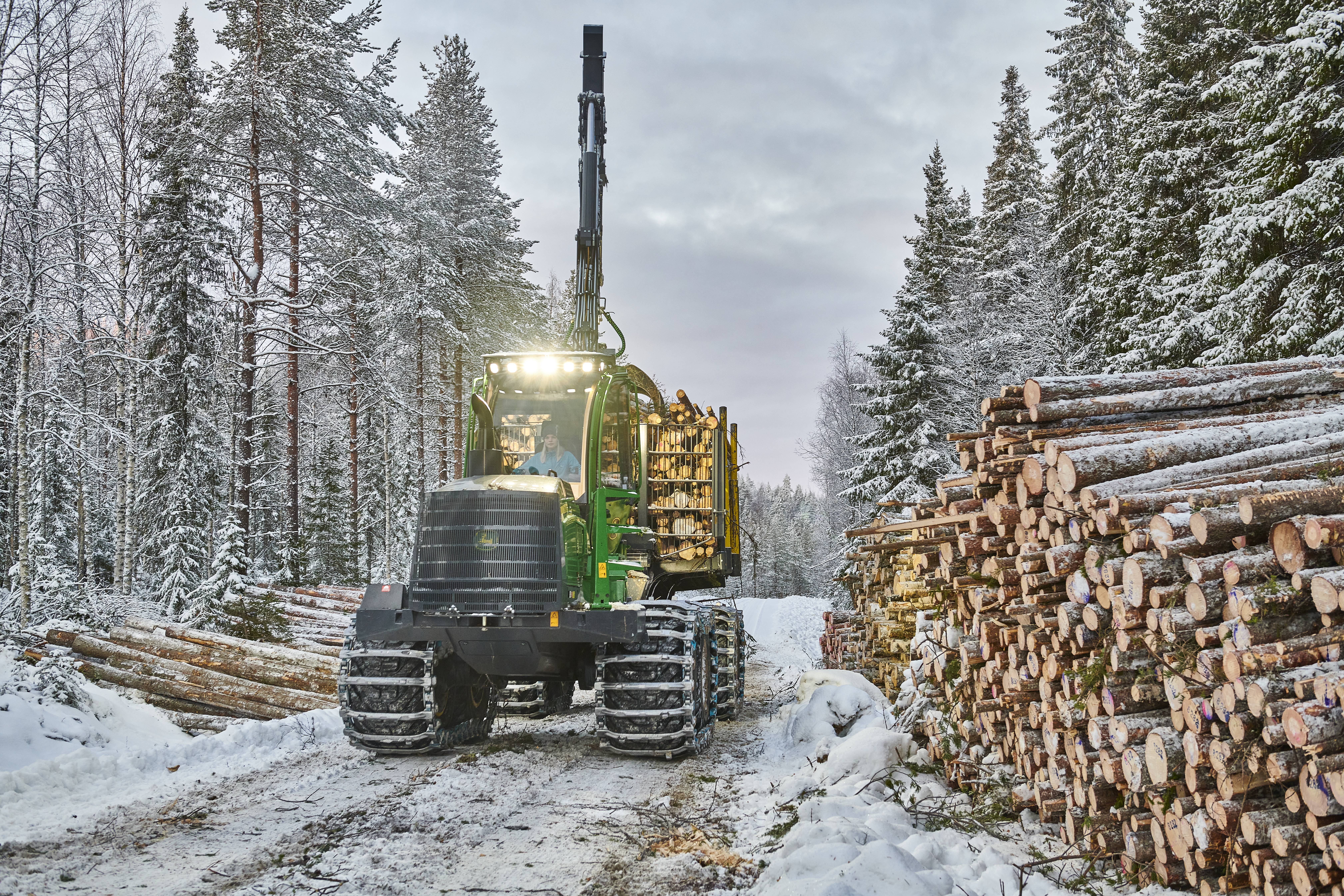 - Beskrivning: Maskinlag i MO Nord, Norrbotten, avverkningslag, avverkning, timmer, virke, skogsbilväg, skogsmaskin, skotare, snö, vinter, avlägg, välta