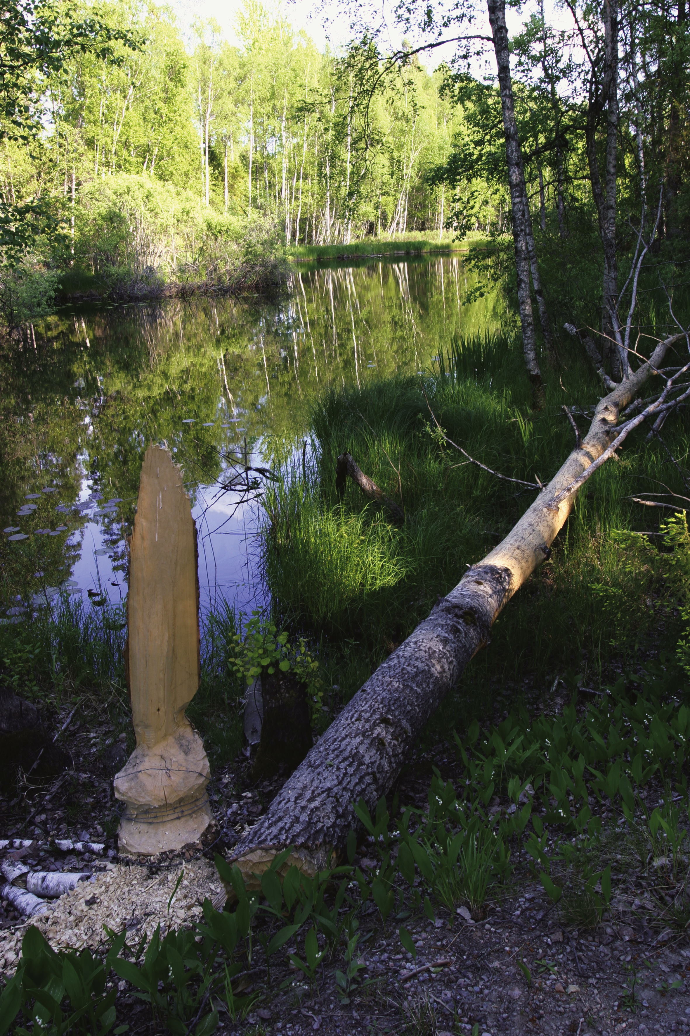 - Beskrivning: Bäver har fällt träd i Ekopark Färna