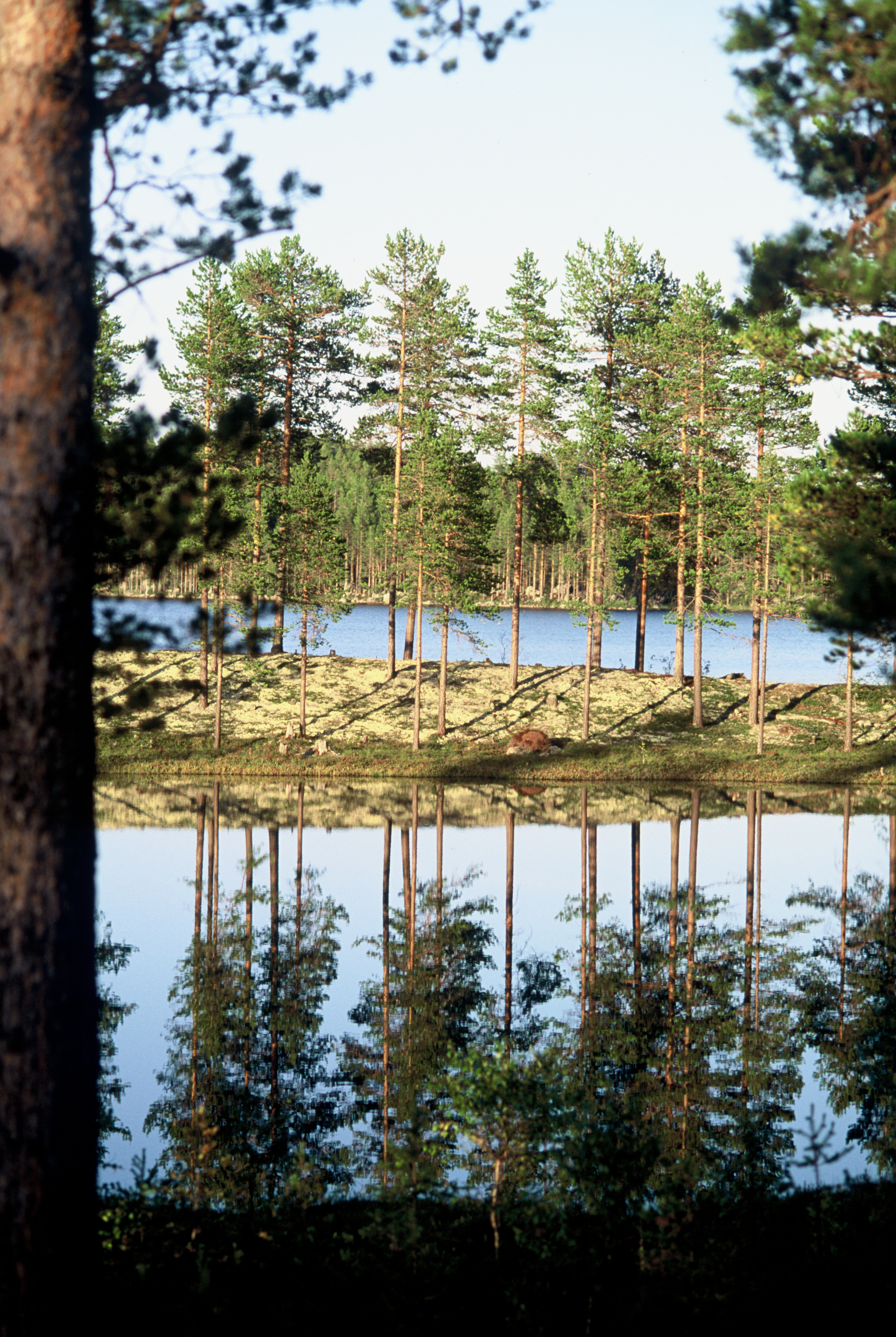 - Beskrivning: Tallskog och spegelblankt vatten
