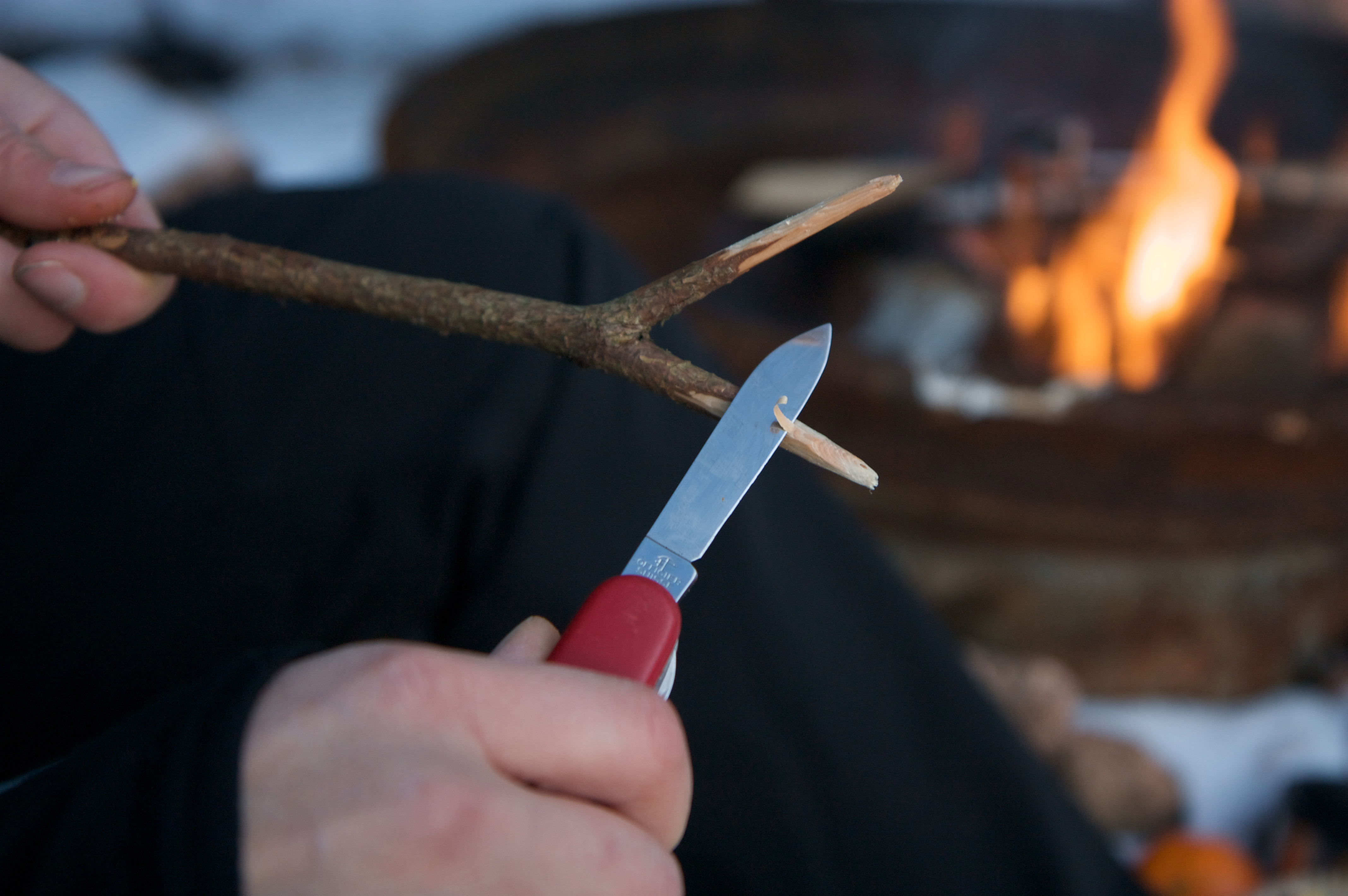 - Beskrivning: Person som täljer grillpinne med kniv, Ekopark Norra Vätterns skärgård