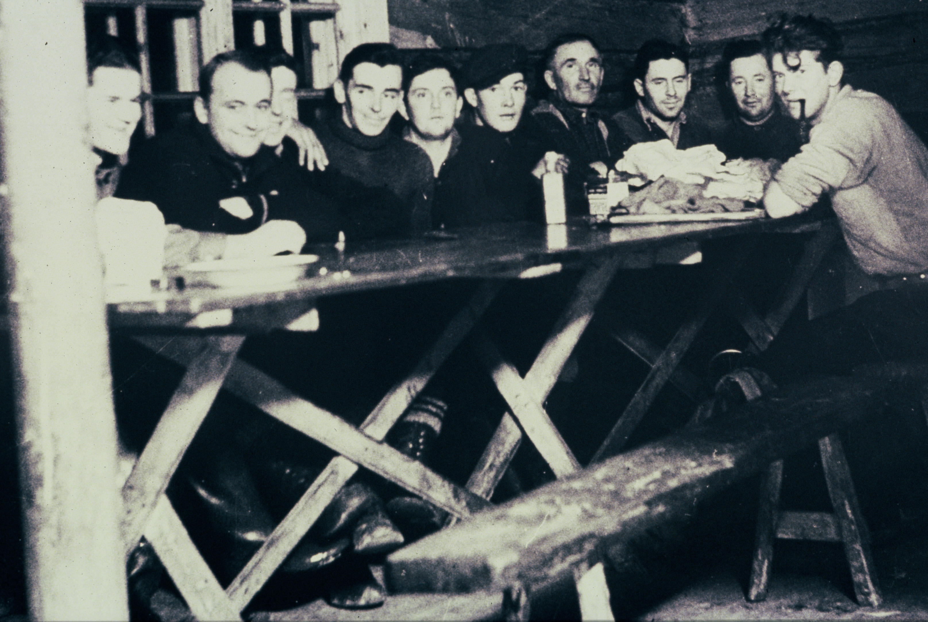 Män i en skogshuggarkoja