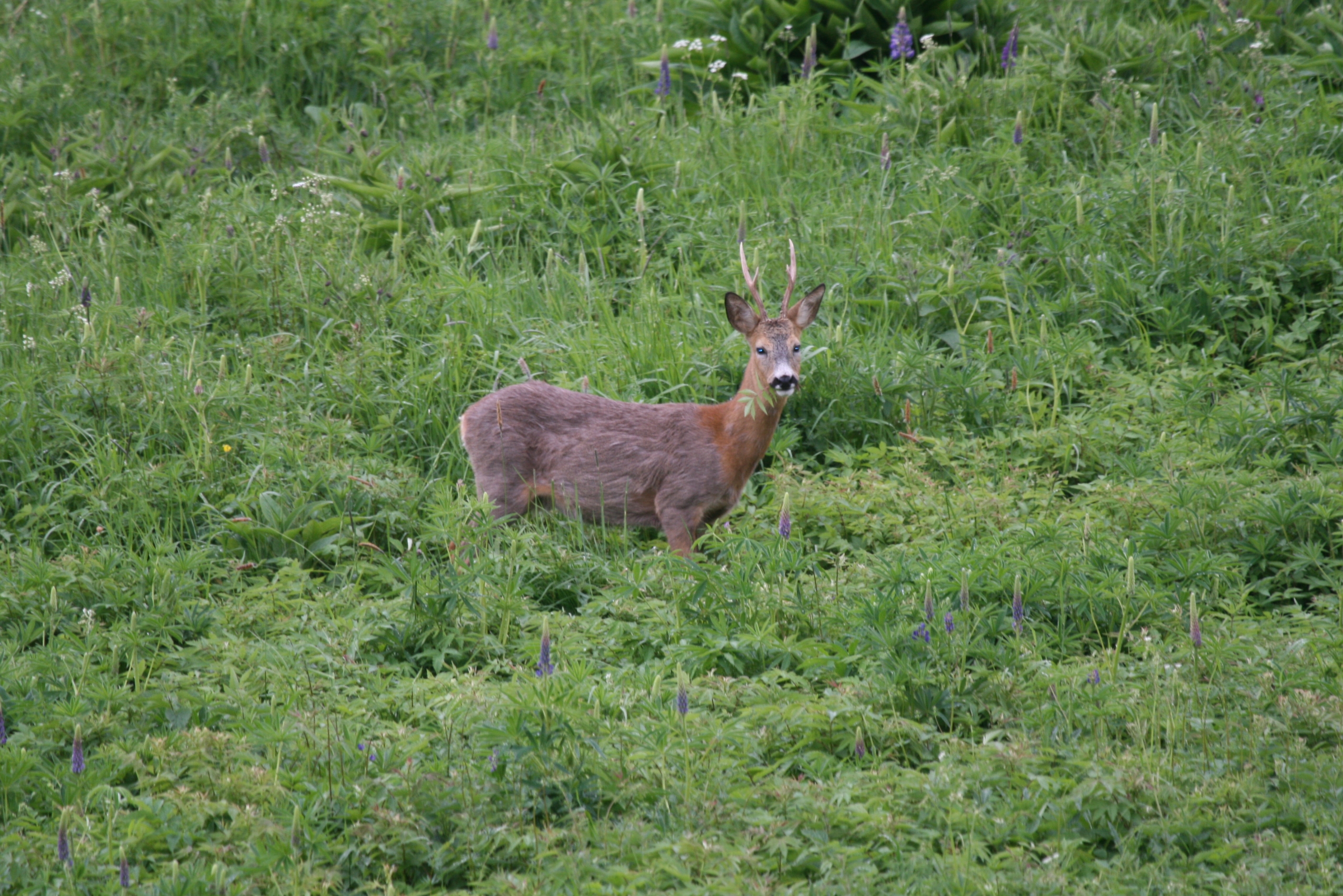 - Beskrivning: Råbock bland lupiner. På väg att byta päls.