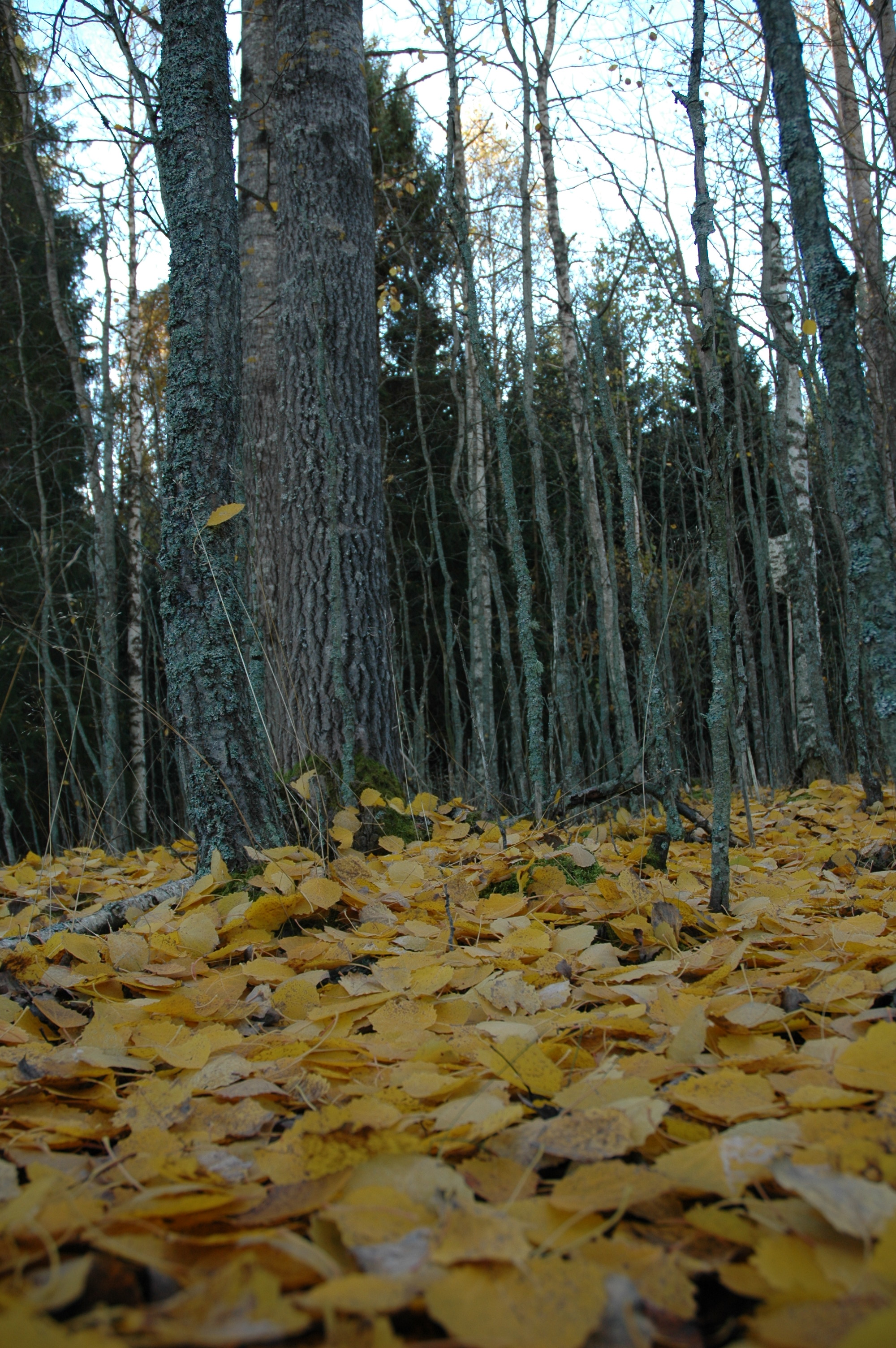- Beskrivning: Fallna asplöv i granna höstfärger