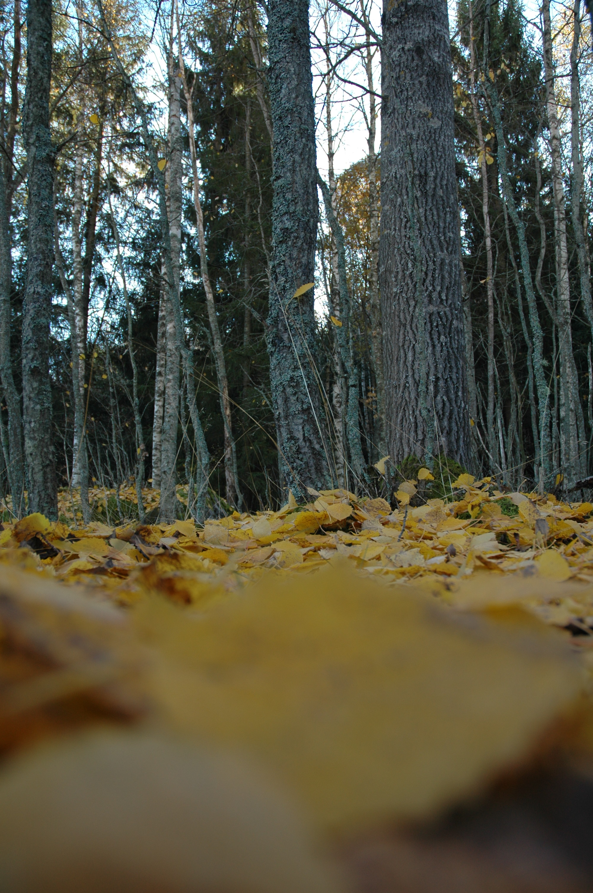 - Beskrivning: Fallna asplöv i granna höstfärger