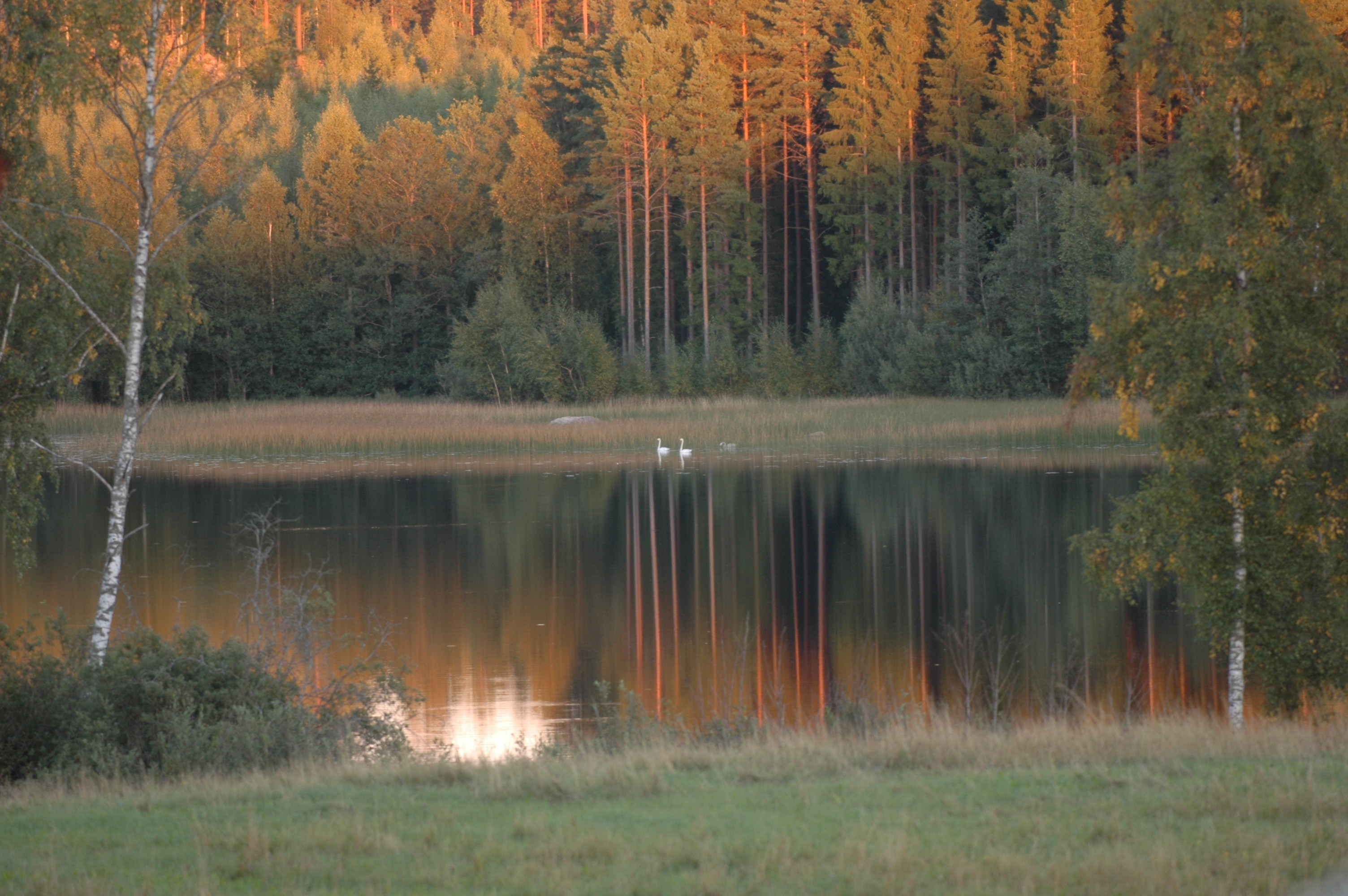 - Beskrivning: Svanar på sjö, höst, lövträd