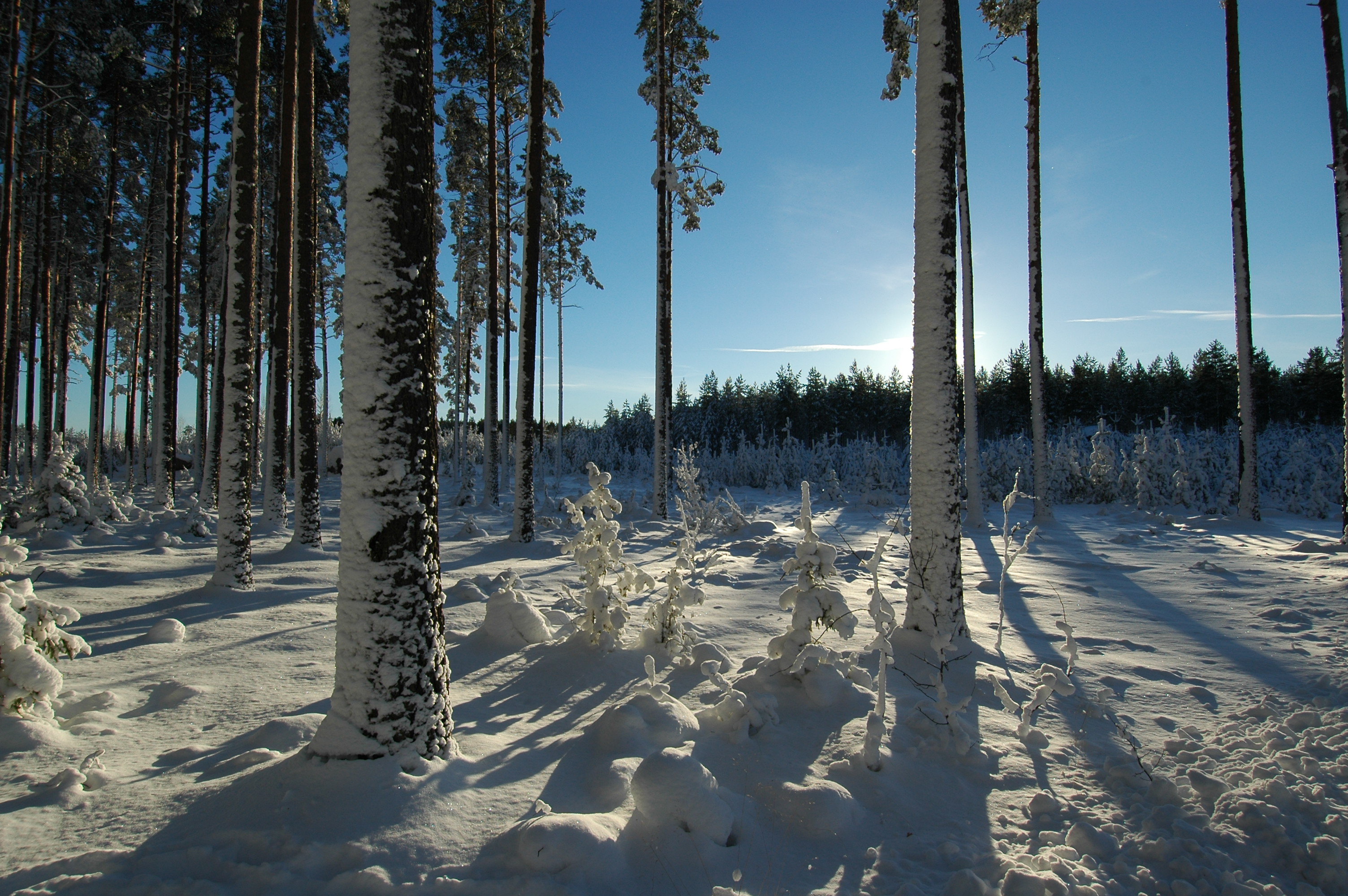 - Beskrivning: Gnistrande solig vinter, tallar efter snöfall