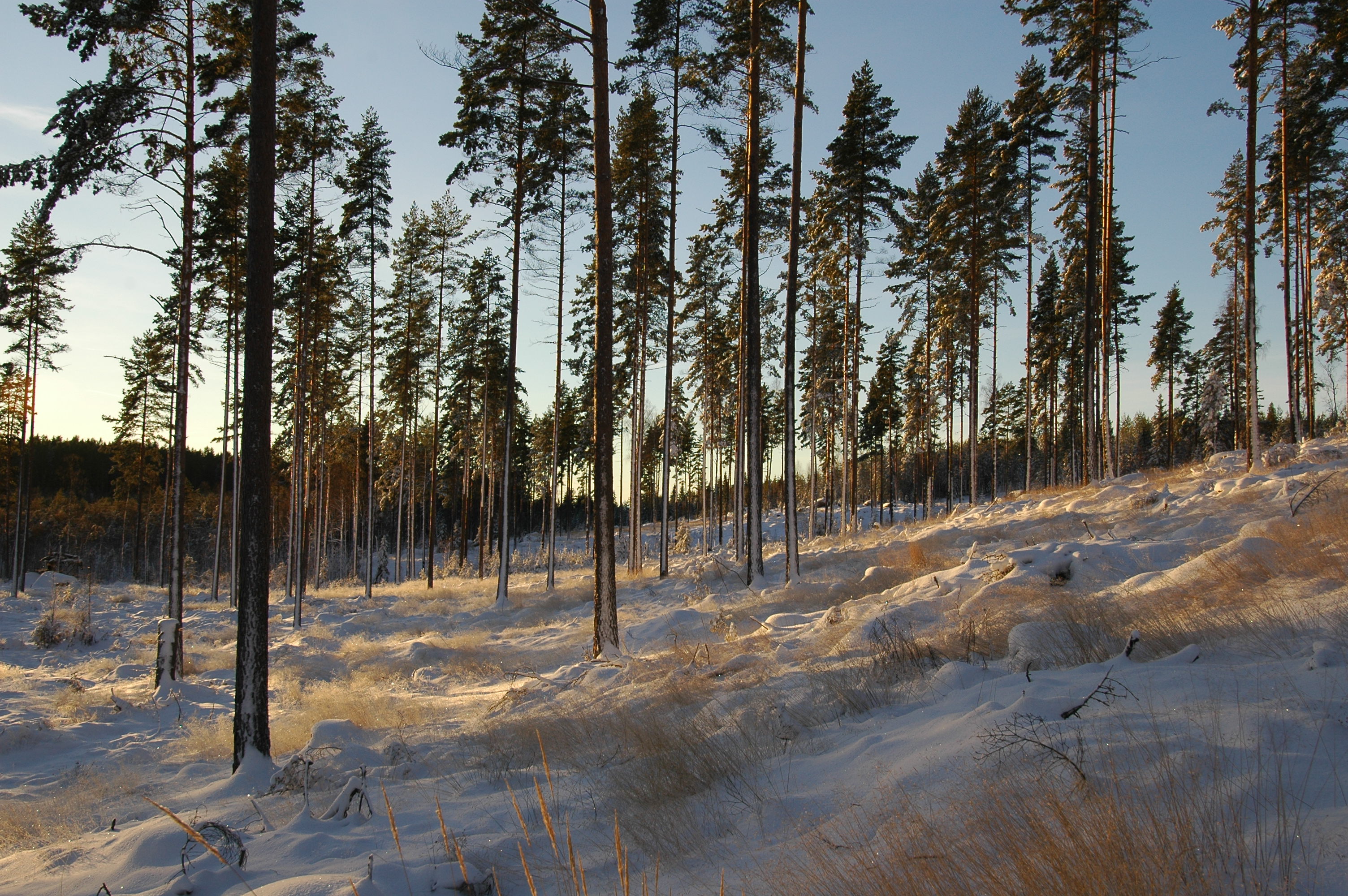 - Beskrivning: Gnistrande solig vinter, tallar efter snöfall