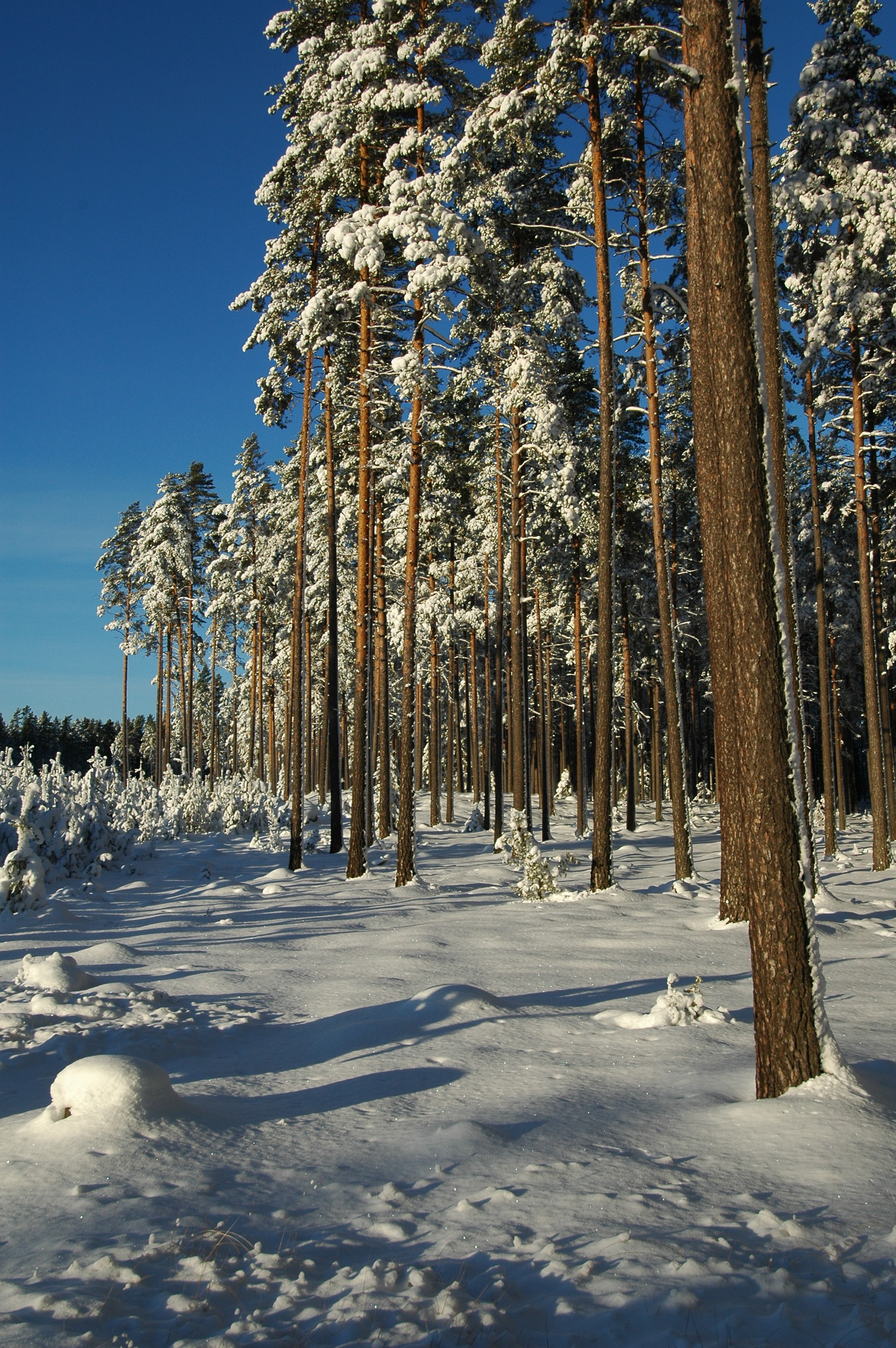 - Beskrivning: Gnistrande solig vinter, tallar efter snöfall