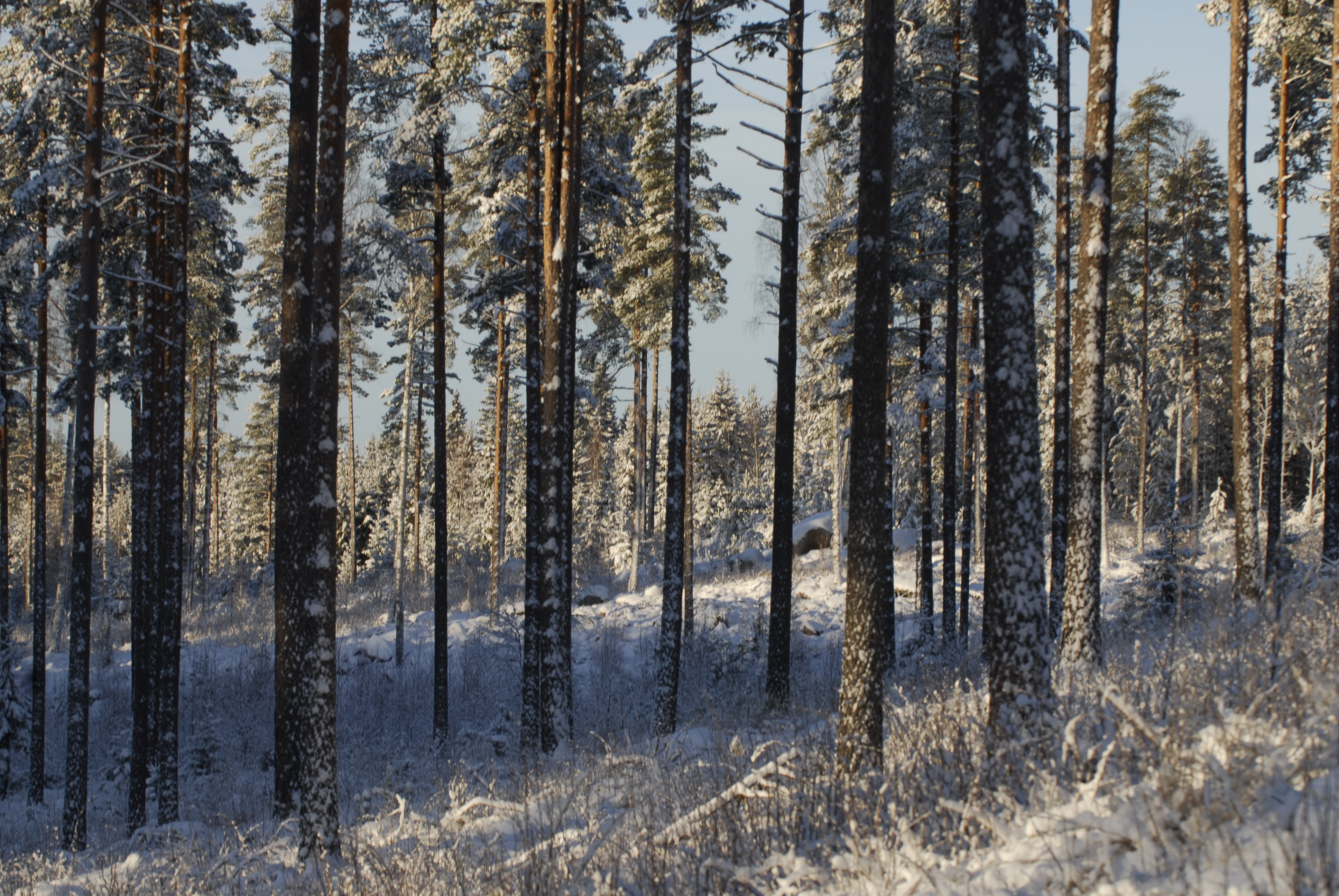 • Beskrivning: Tallskog, stammar i vintrig miljö, vinter
