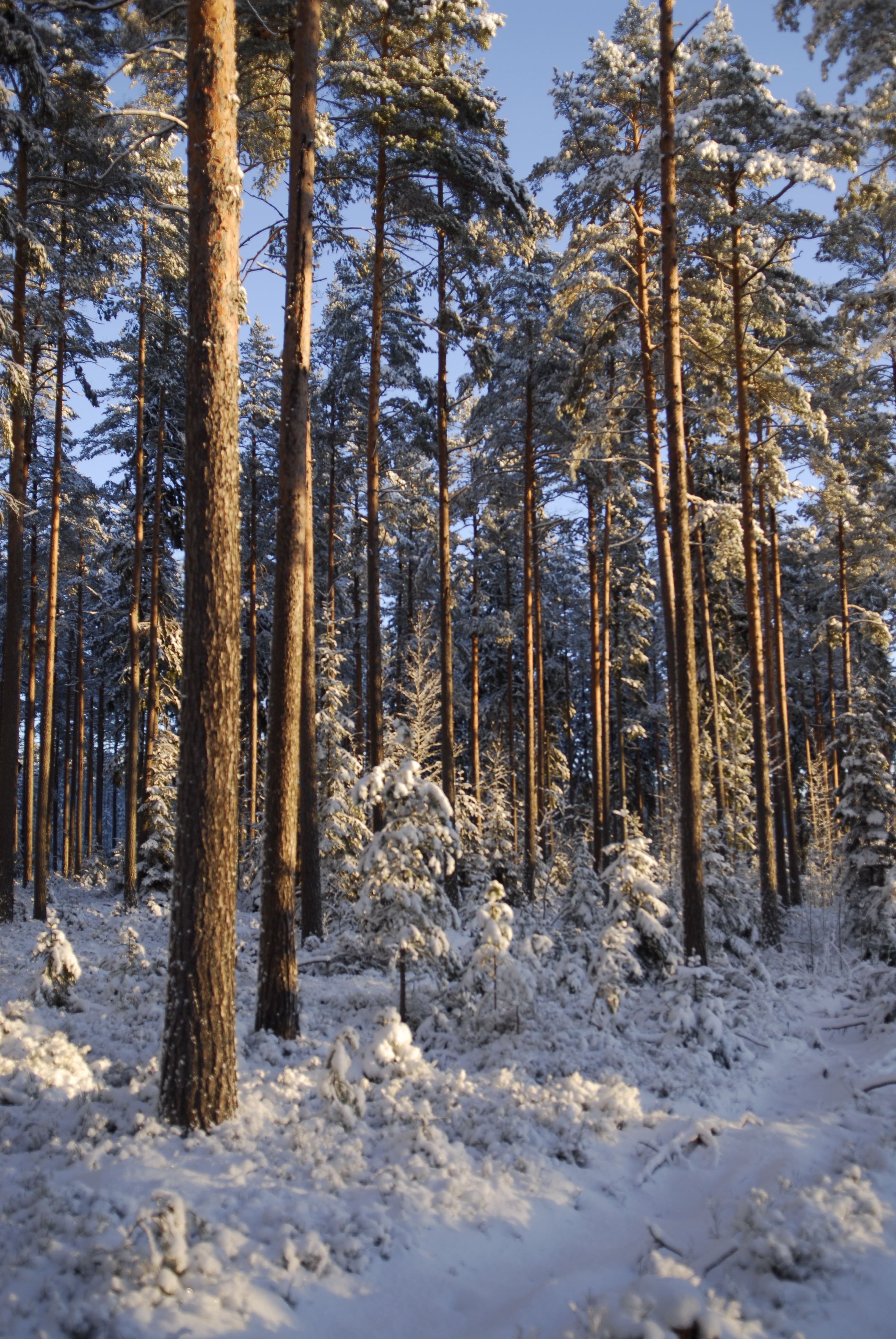 - Beskrivning: Tallskog, stammar i vintrig miljö, vinter