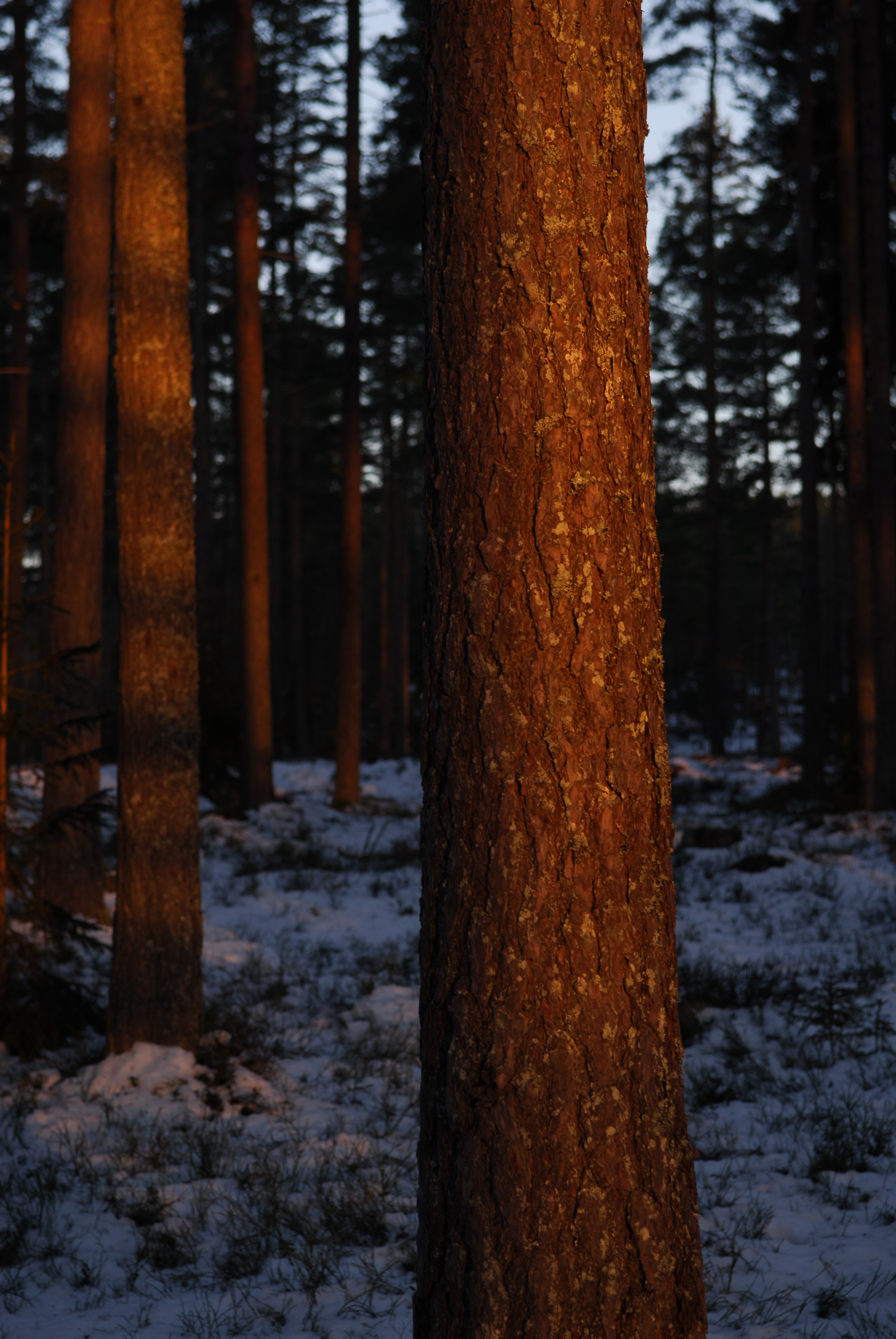 • Beskrivning: Tallskog, stammar i vintrig miljö, vinter