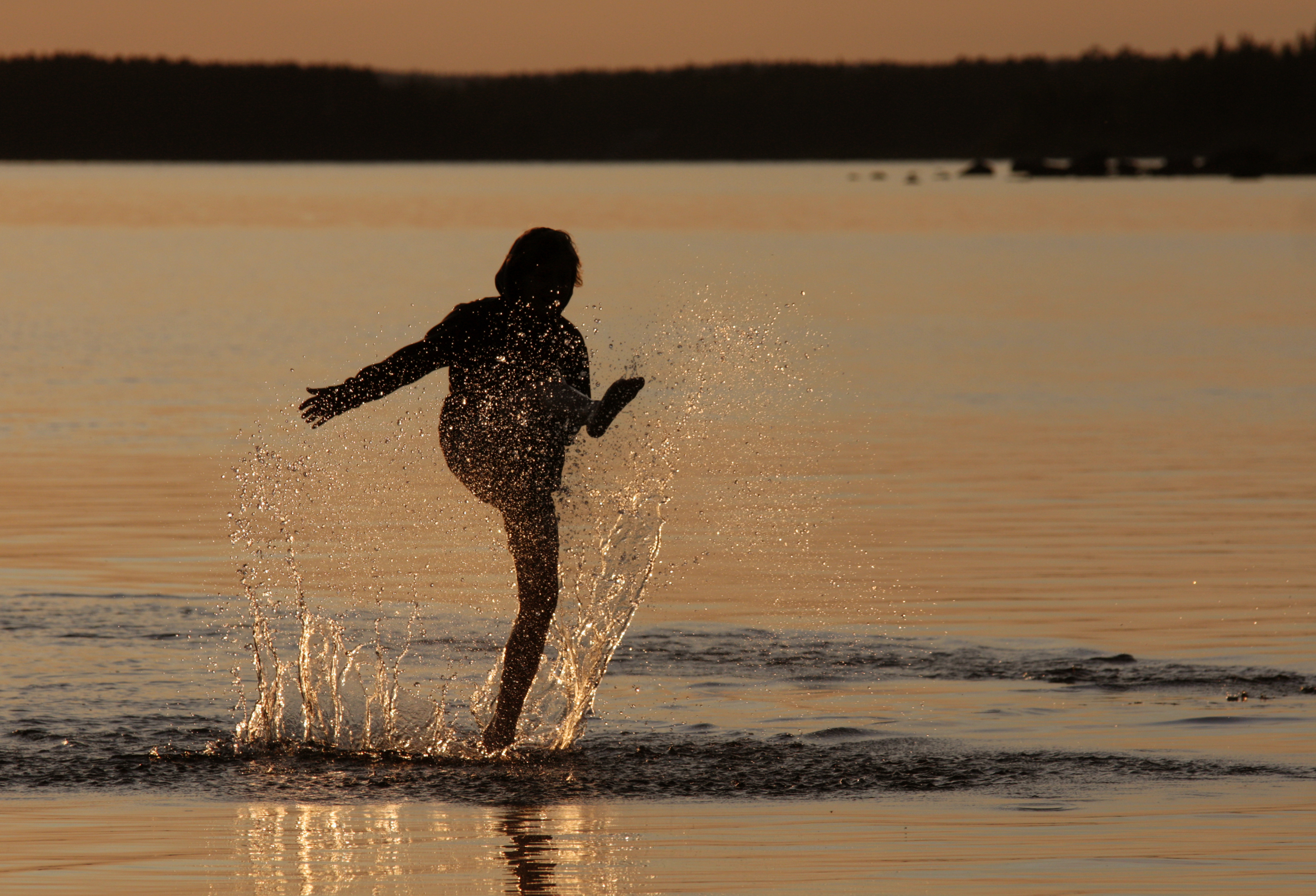 - Beskrivning: Bad i Bottenviken, sommarkväll, sparkar i vatten, vattenkaskad