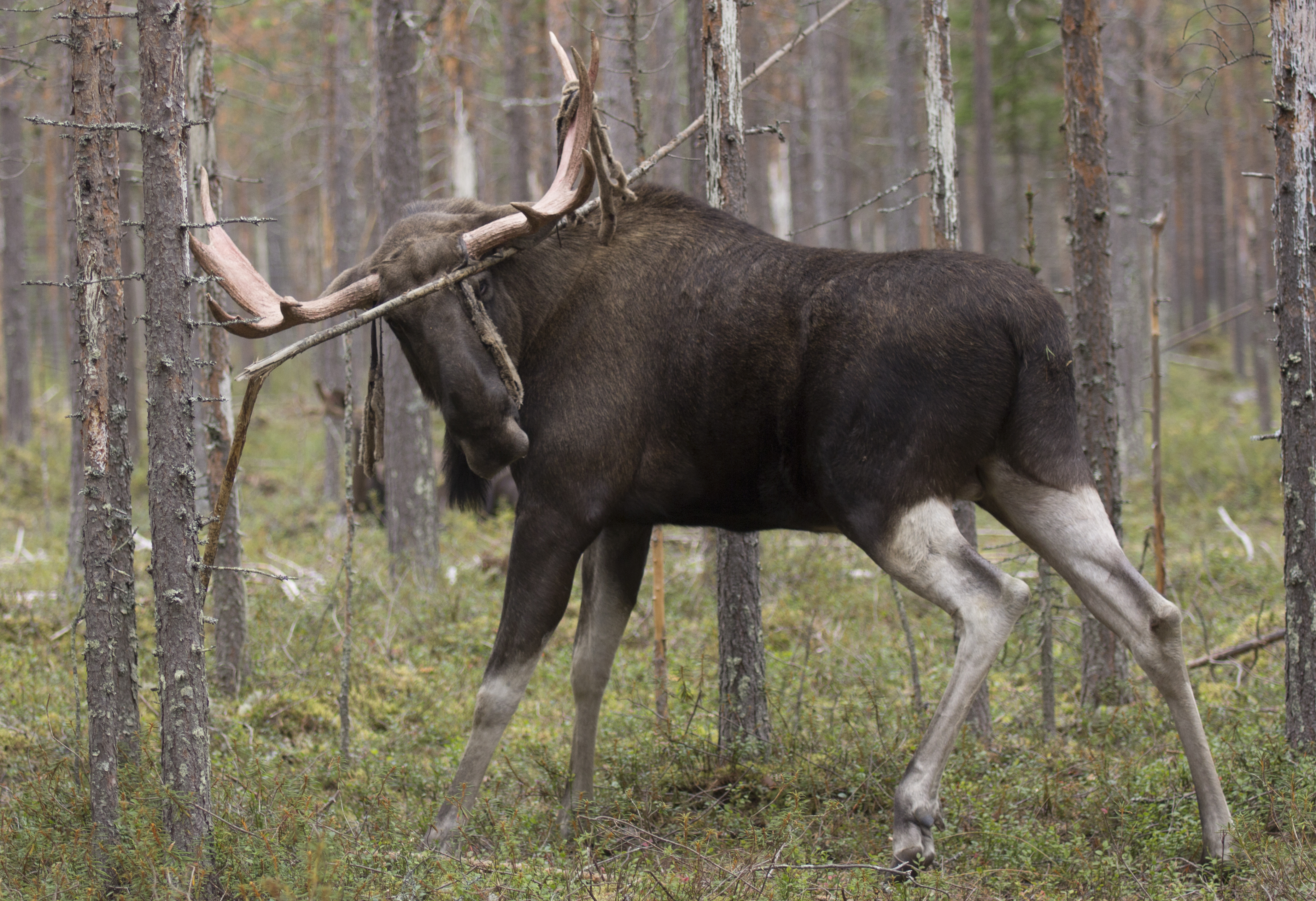 - Beskrivning: Älgtjur som fejar hornen och detta är ovanligt att se i det vilda, det pågår några få dagar under hösten, precis innan brunsten