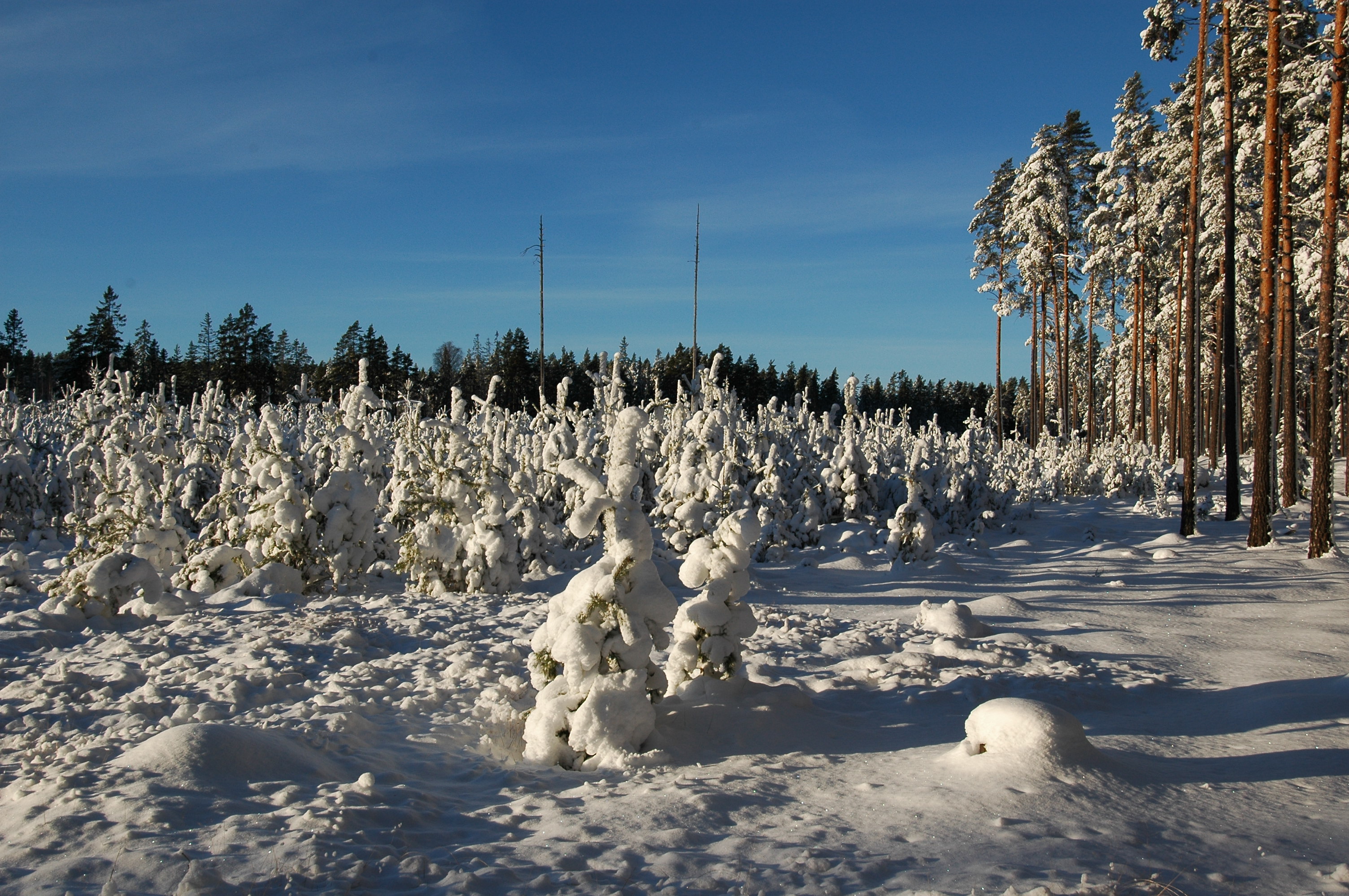 - Beskrivning: Plantering, stammar, tallar, vinter, snö