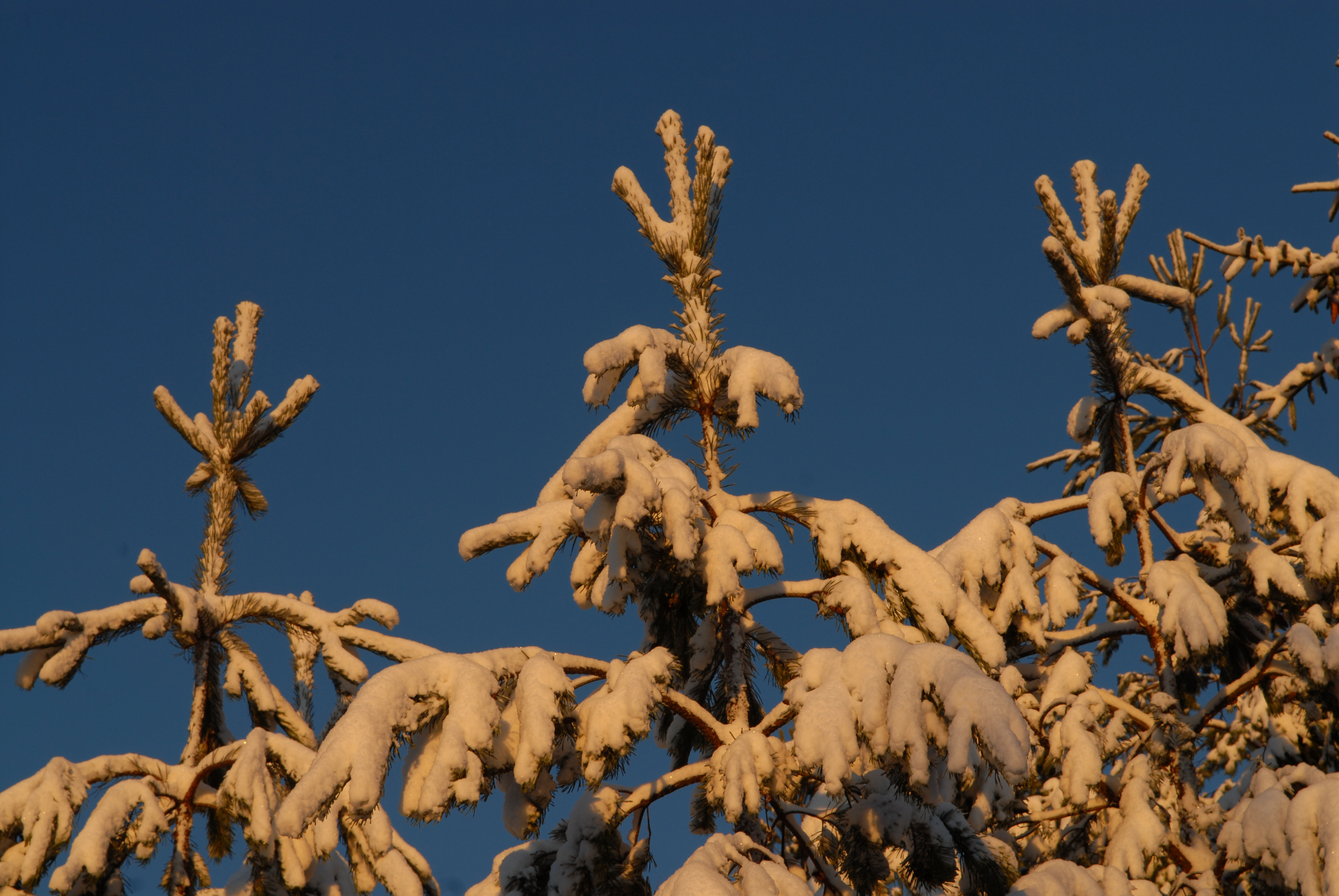 • Beskrivning: Plantering, växande tallskog med snötyngda kvistar