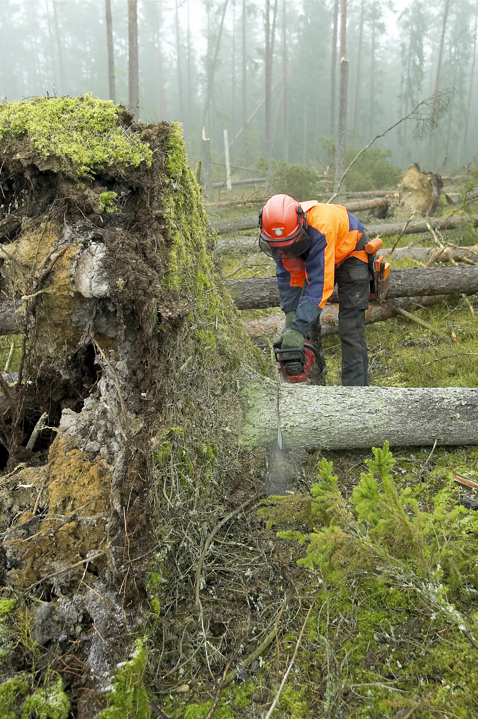 - Beskrivning: Skogsarbetare, motorsåg, vindfällen, storm, gudrun