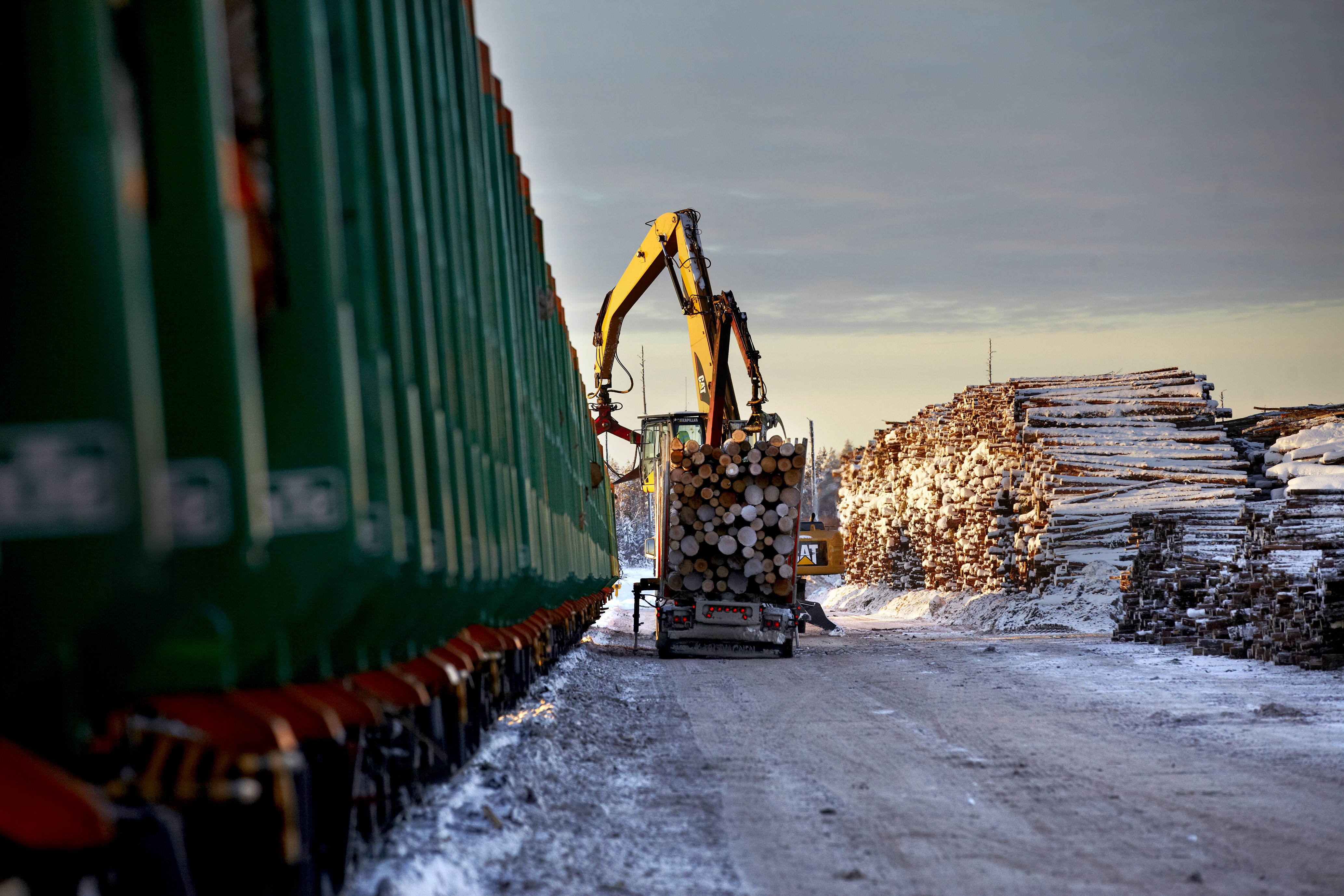 - Beskrivning: Logistik, lastning, lossning, tåg, virke, timmer, stockar, järnväg. Virkesterminal Stockaryd 2010-12-09