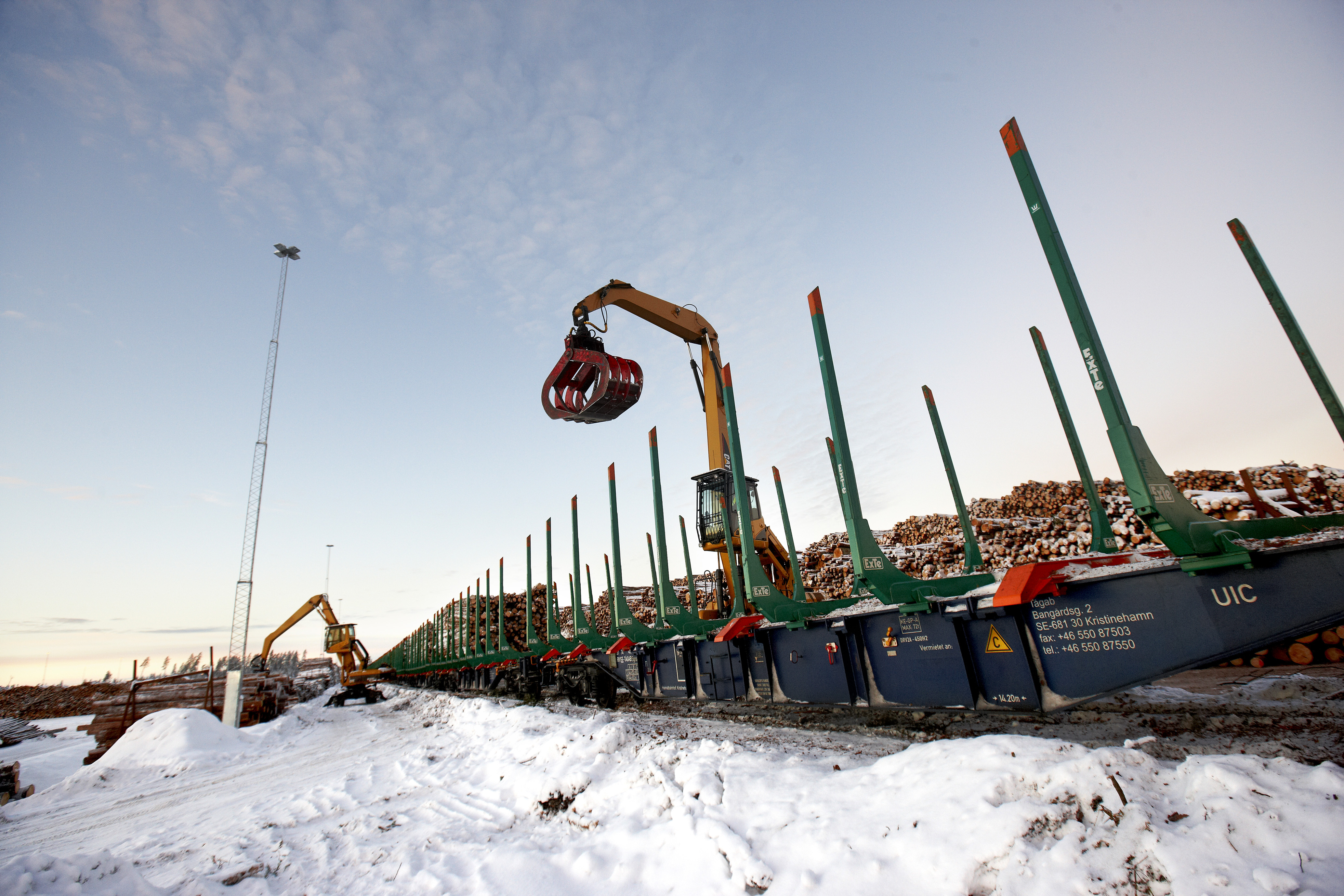 - Beskrivning: Logistik, lastning, lossning, tåg, virke, timmer, stockar, järnväg. Virkesterminal Stockaryd 2010-12-09
