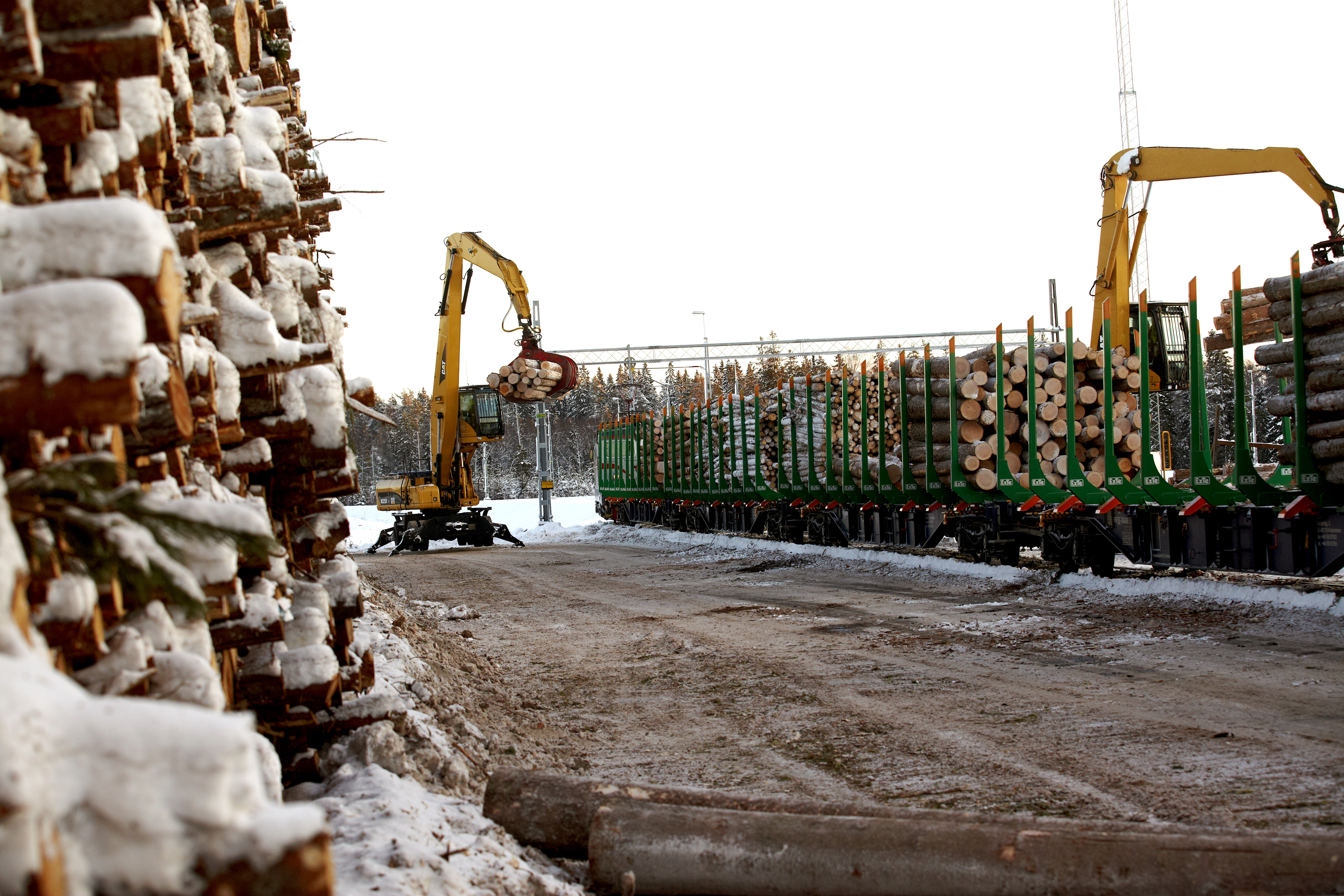- Beskrivning: Logistik, lastning, lossning, tåg, virke, timmer, stockar, järnväg. Virkesterminal Stockaryd 2010-12-09