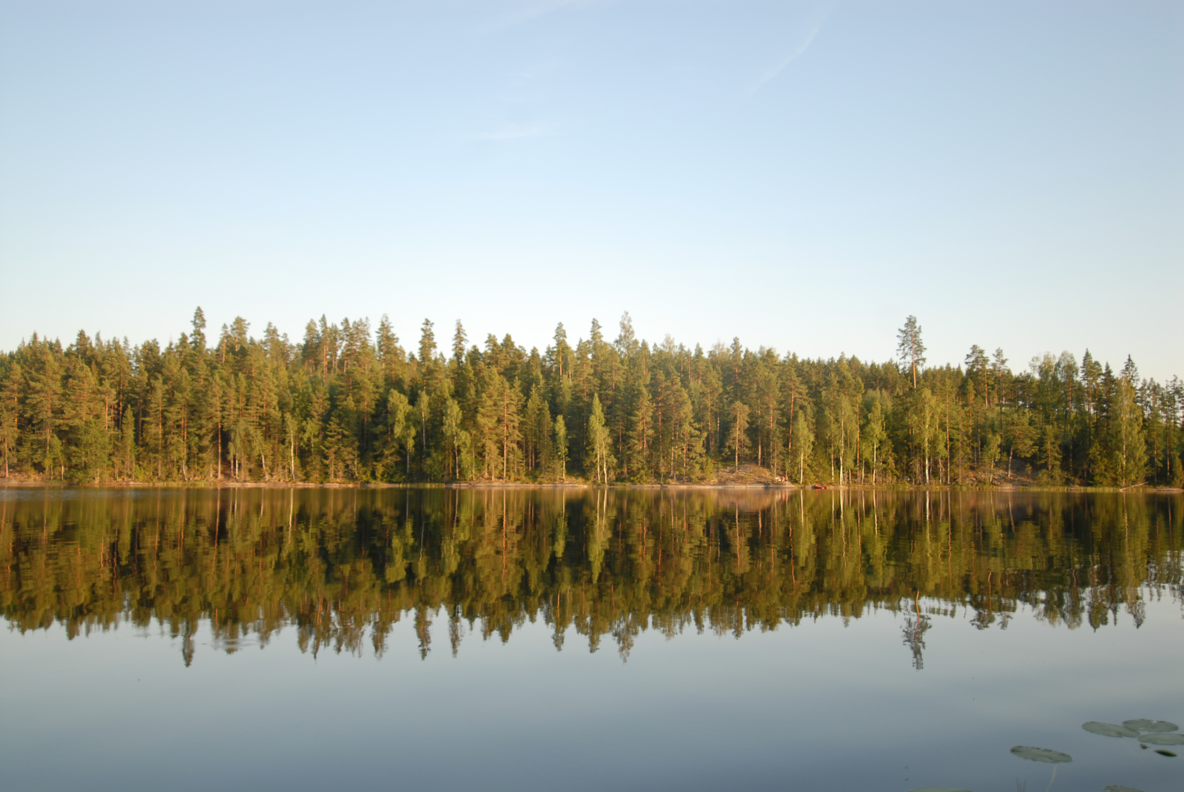 - Beskrivning: Sjölandskap i sommarkväll, spegelblankt vatten