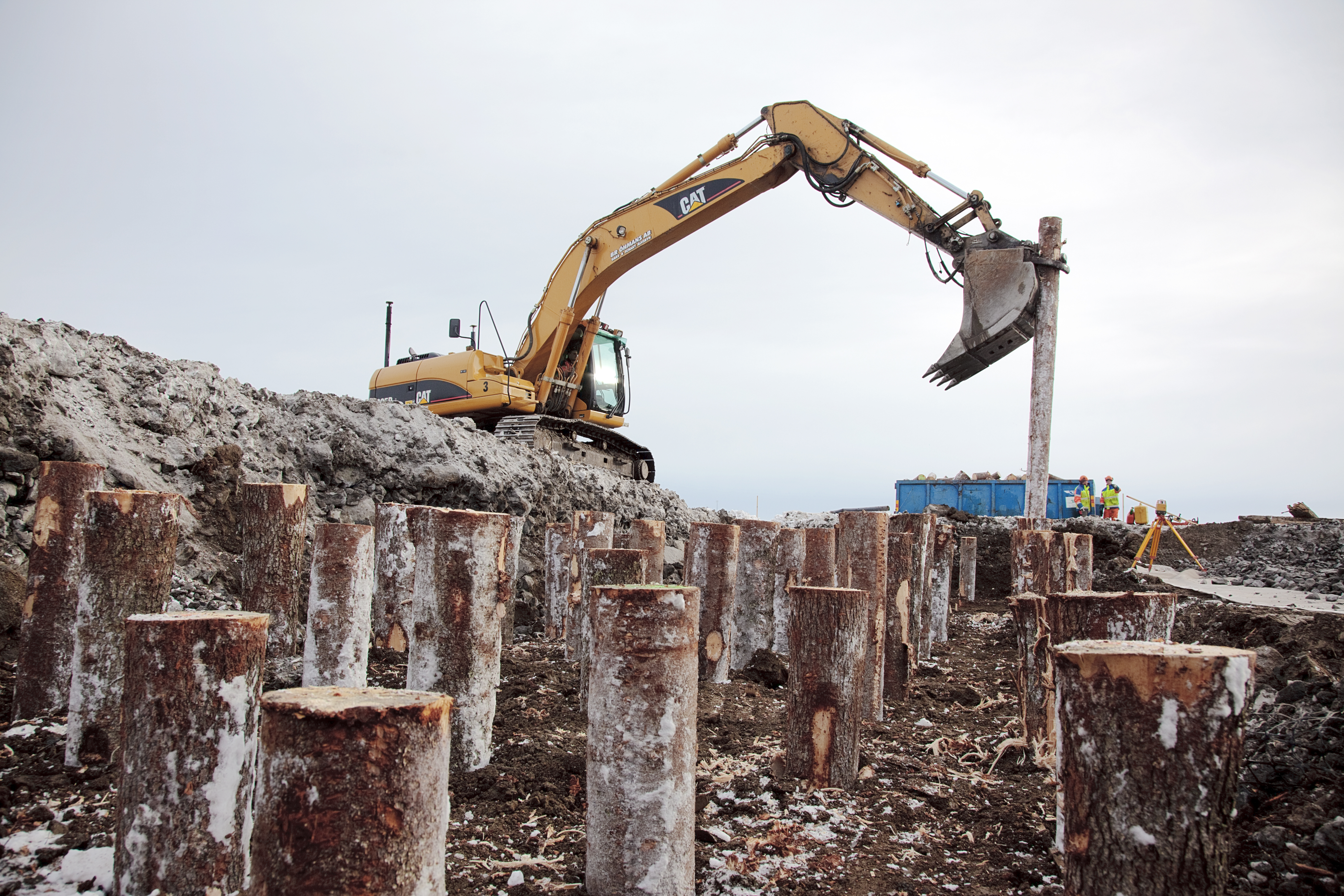 - Beskrivning: Pålning, 7 500 pålar av gran bankas ner i backen för att göra nya norra länken i Umeå körbar.