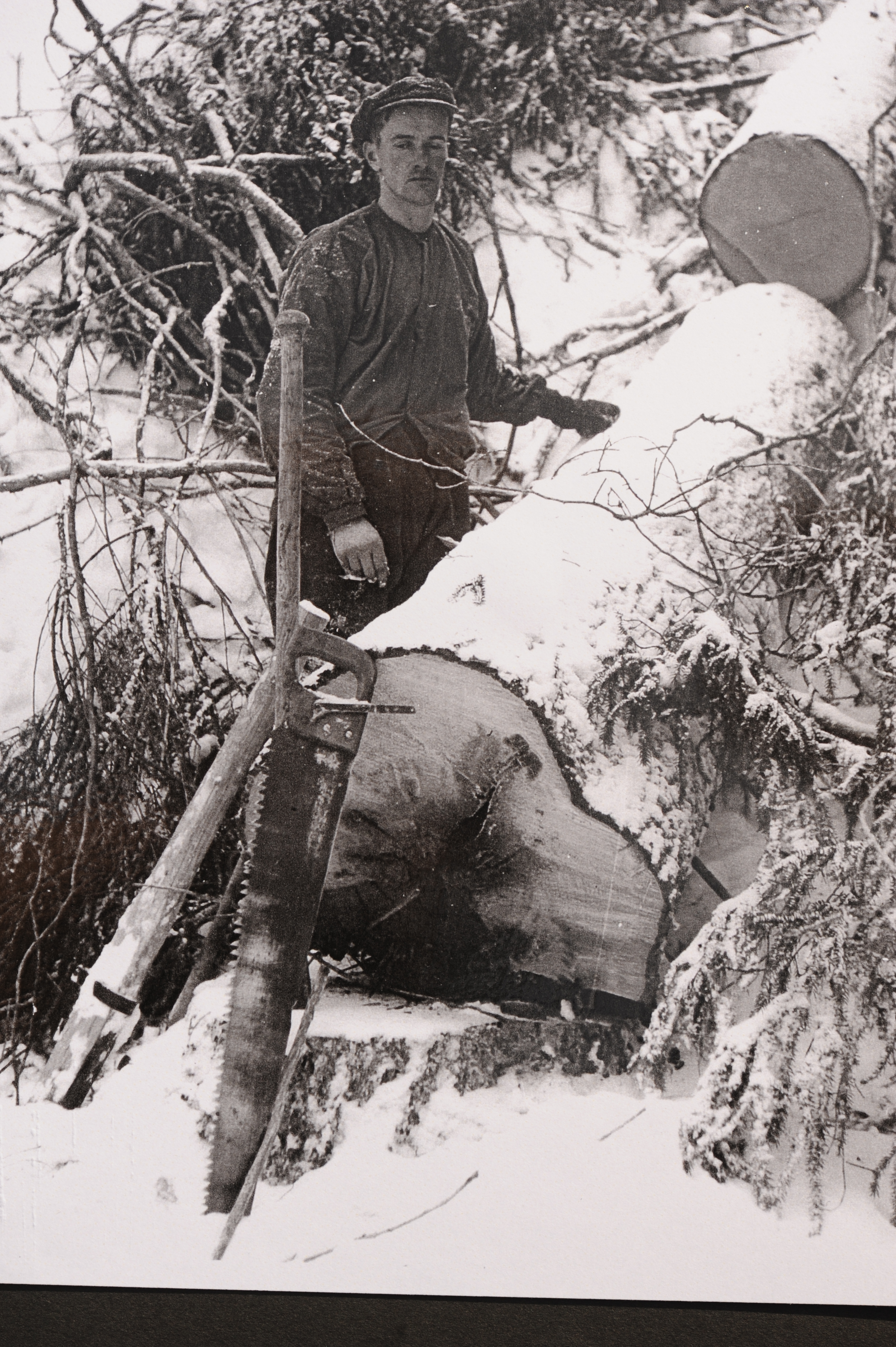 • Beskrivning: I så gott som hela sitt yrkesverksamma liv arbetade Thor Liljemark från Brunnsberg som skogshuggare på kronoparkens östra revir i Älvedalen. I unga år vann han en kamera på lotteri som kom att bli hans följeslagare i skog och mark. Vid sin bortgång efterlämnade han ett brett bildmaterial samt dagboksanteckningar om skogsarbetarlivet. Av ett urval bland bilderna återges här bland annat dom mödosamma arbetsuppgifterna som hörde till skogsarbetet under 1900-talets tidigare hälft. På bilden poserar fotografen bredvid en präktig granlump tillsammans med sin arbetsredskap, timmersvansen, yxan, barkspaden och vändhaken vid Ränndammen vintern 1935.