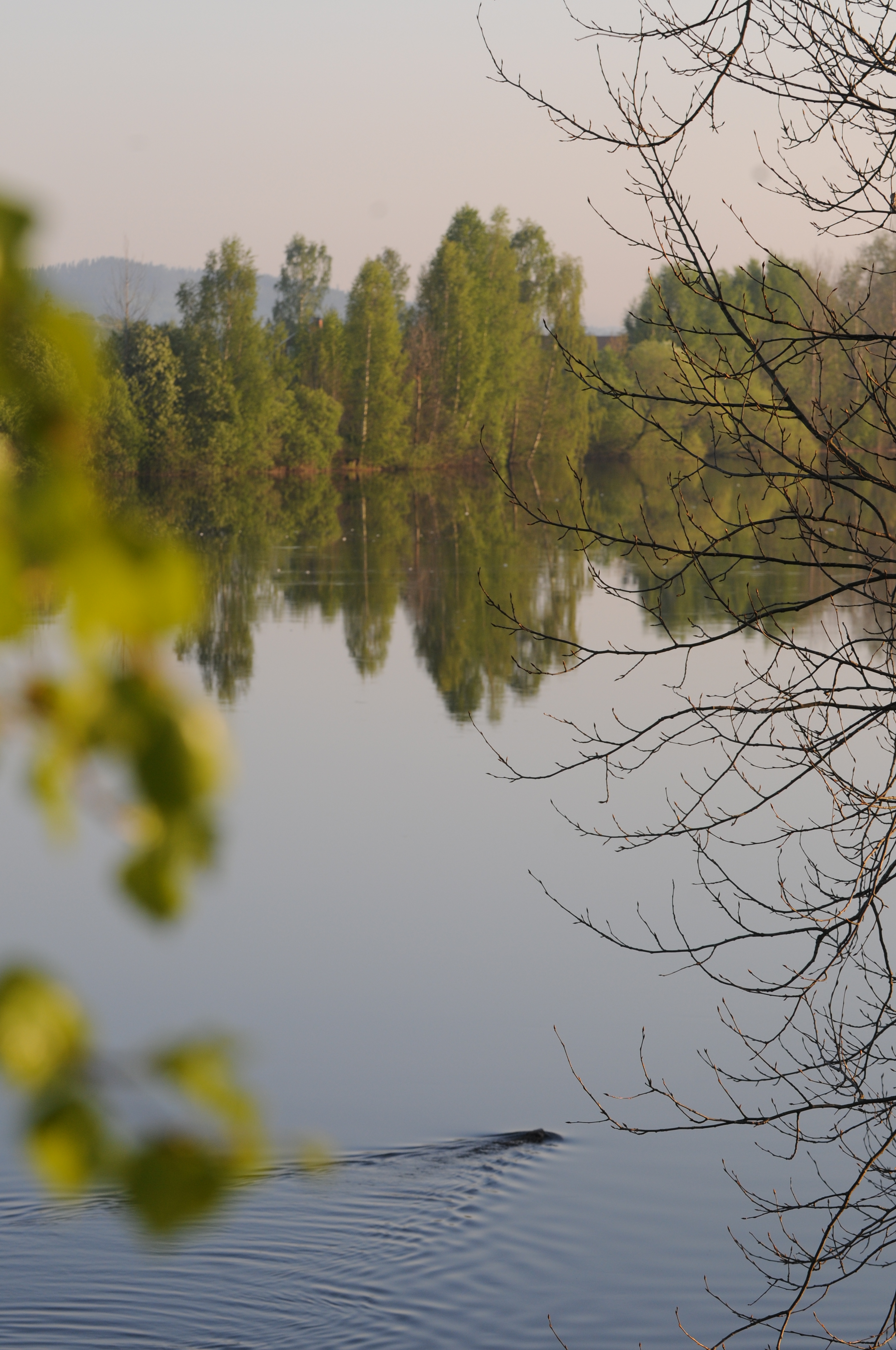 - Beskrivning: Spegelblankt vatten. Ett djur som simmar i vattnet. Husbyringen