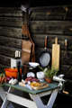 Beskrivning: Köksfavoriter efter jakten, skinnförkläde, knivblock, köttkniv, stekpanna, efter jakt, köksvåg