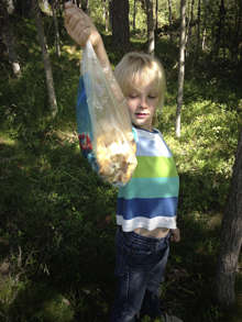 Beskrivning: Påsen full på skogspromenaden på Vindö, Stockholms skärgård. Påse med svamp, svampplockning, svampplockare