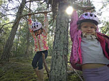 Beskrivning: Vera och Emilia Hiltula på skogsutflykt, hänger i träd, klättra, utflykt