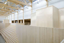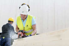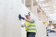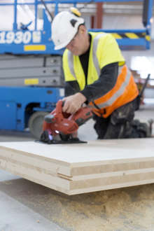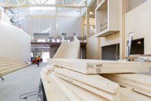 Beskrivning: Vad som för drygt 70 år sedan startade som ett småskaligt snickeri i Sikfors utanför Piteå har idag utvecklats till en betydande leverantör för den japanska virkesmarknaden, råvara i rätt längd och kvalitet förädlas av Stenvalls Trä till lamina för jordbävnings säkra hus i Tokyo och Osaka, Forum Sveaskog nr 1 2020, trappa, rött hus, snö, vinter, arbetare, reflexväst, sågverk, snickeri