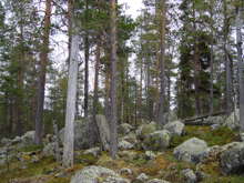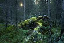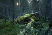 Beskrivning: Ekopark Piteälven, grannaturskog, mossa, fallna träd, glänta