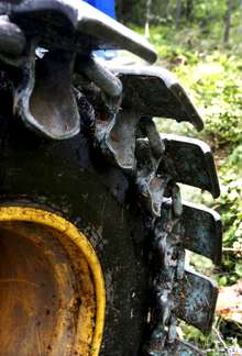 Beskrivning: Ny skördare med större däck, band runt däcken, Blött ett minne blott, avverkning, mindre körskador